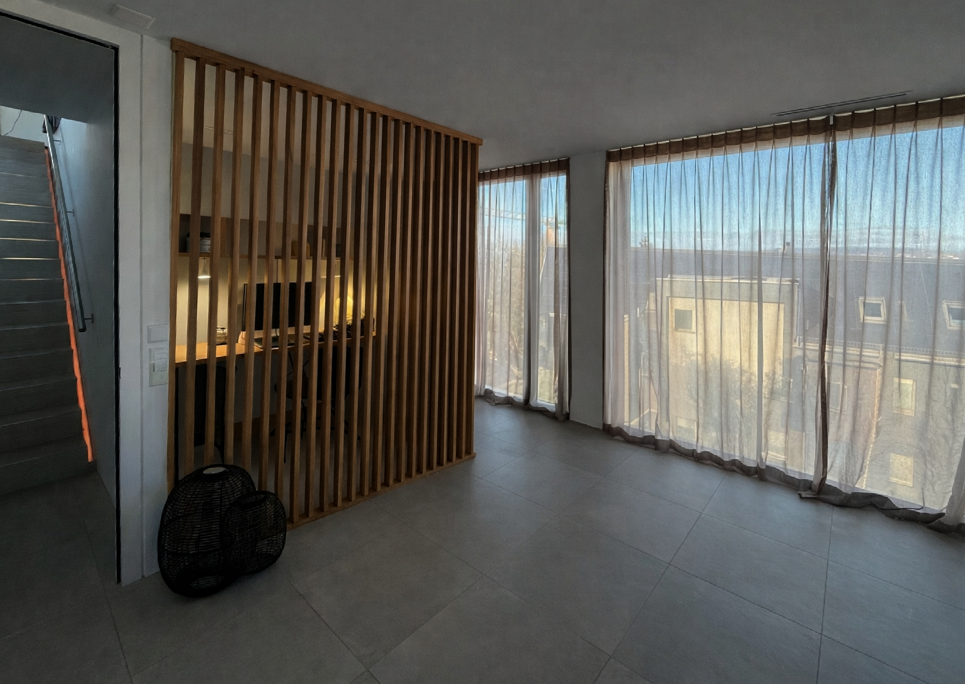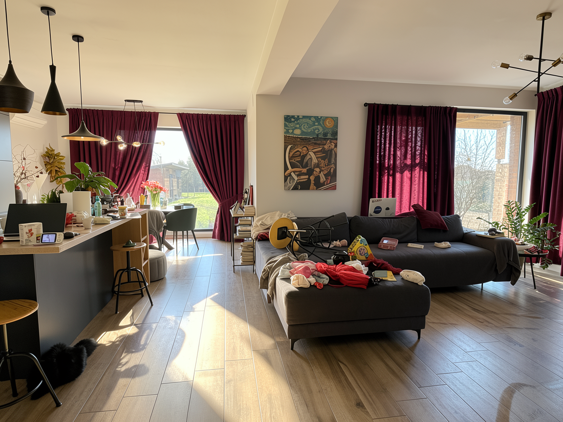 genau dieses rendering berarbeiten fotorealistisches innenraum foto exakt dieselbe perspektive und kameraposition wie das hochgeladene referenzbild 100 identische raumgeometrie exakt gleiche m belanordnung weiches nat rliches tageslicht leicht schr g einfallende sonne geschlossene r ume k nstlich ausleuchten sanfte realistische schatten blickrichtung ist nach osten sonnenlicht kommt von s den decke weiss ral 9016 holz eiche hell platten beige matt t re weiss ral 9016 hinter der wand rechts ein pult f r homeoffice in der mitte des raumes ein b gelbrett mit grauem stoffbezug belebe die szene mit europ ischen menschen um die 40 in alltagssituationen realistische materialien echte holztexturen stoff mit leichten gebrauchsspuren hochwertige oberfl chenreflexionen kleine gr npflanzen im raum nat rliche farbwiedergabe leicht warme farbstimmung golden hour feeling das bild muss wie eine professionelle fotografie aussehen es soll ein echtes und reales foto sein canon eos r5 35 mm festbrennweite f 2 8 hyperrealistisch dslr qualit t raw aufnahme 8k aufl sung extrem scharf perfekte tiefensch rfe professionelle architekturfotografie