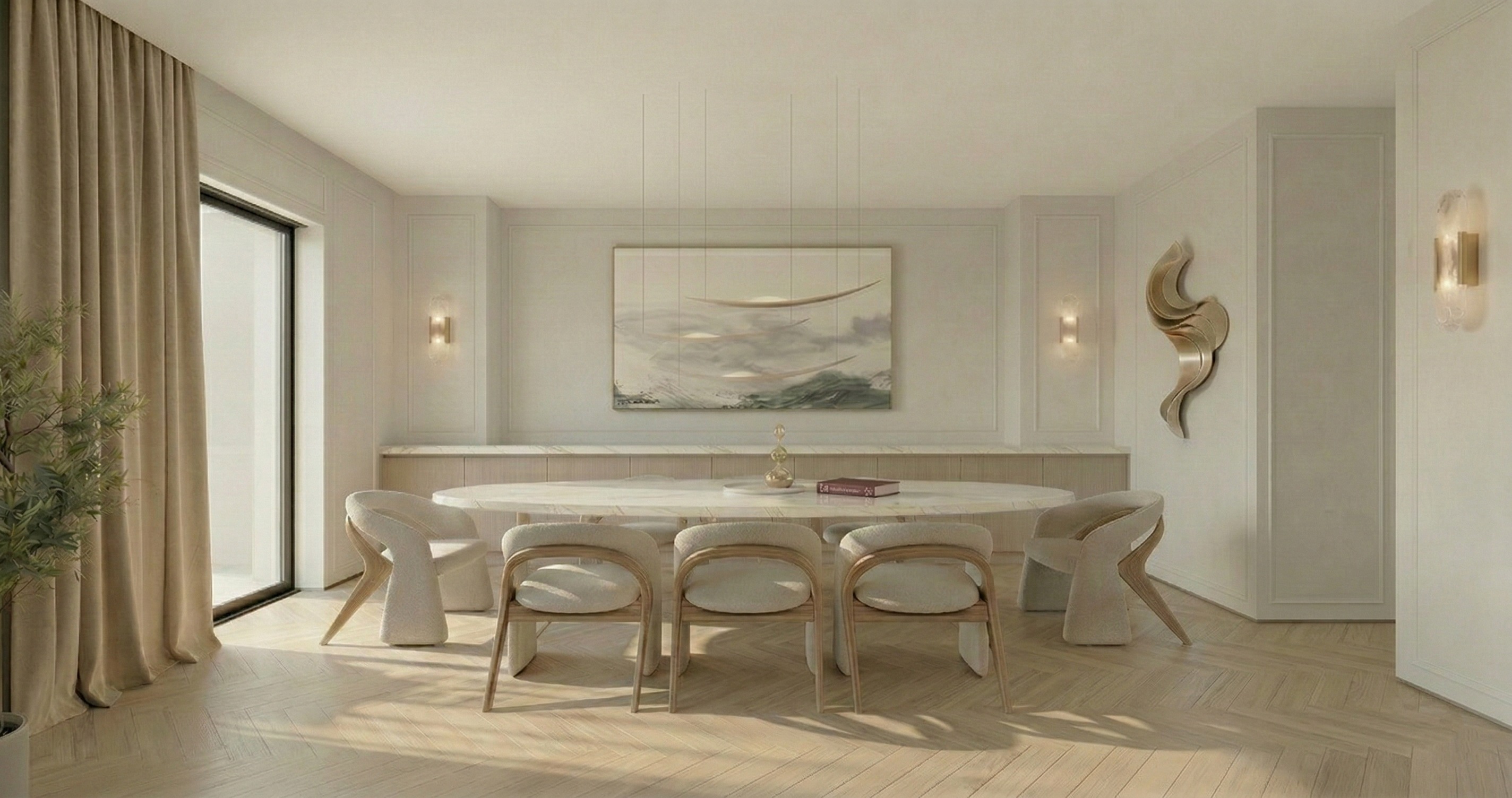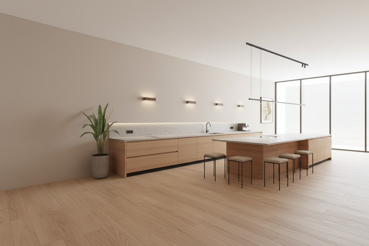 take this semi final render and enhance realism without altering any of the current image s geometry features or objects as well as image orientation no cropping zooming etc final result must be 4k do not add any new objects keep the herringbone pattern exactly as is but increase the tonal variation between individual planks each stave should have a distinct natural shade ranging from light sand to muted beige change the surface to an ultramatte raw timber texture with visible open grain removing all artificial sheen or plastic like smoothness the goal is to see a clear organic contrast in color from one tile to the next emphasizing its wooden nature yet making the effect visible yet delicate and so it doesnt stand out too much the goal is for the change from the original to be subtle