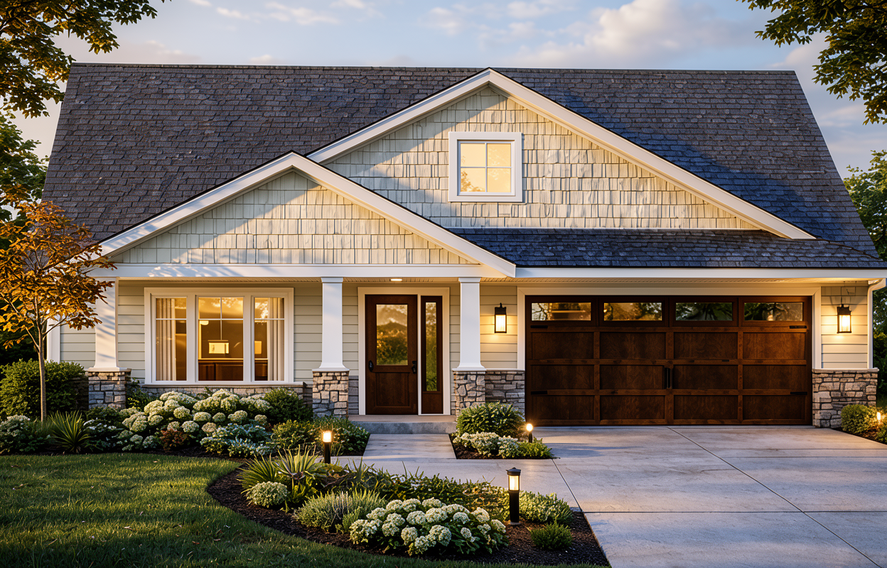 change eaves to black make roof black shutters black windows black stone light beige and gray mix light beige brick lush landscaping turn on lights
