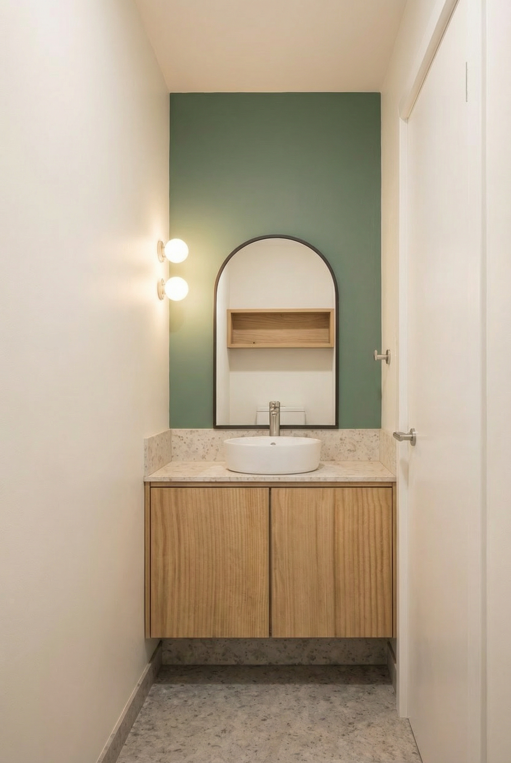 provide dulux sage green paint to wall behind mirror provide brushed brass tapware and fixtures provide brushed brass mirror frame provide soap dispenser and pot flower next to vanity