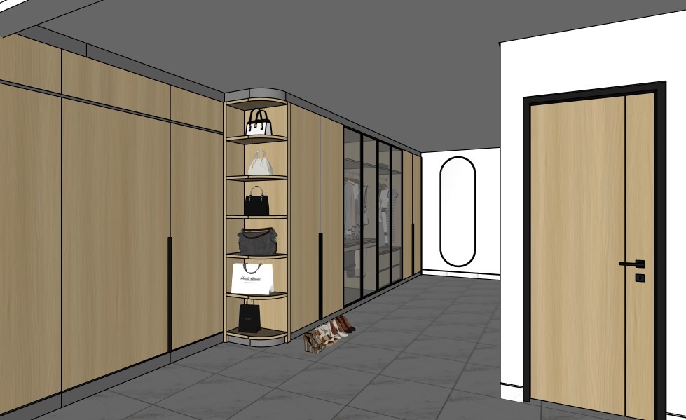 render a modern wardrobe hallway with a sleek sophisticated design use light oak wood for the cabinets and doors giving them a warm and inviting texture with gray edge incorporate glass faced closets with softly reflective surfaces to add depth the floor should have polished white marble tiles exuding luxury paint the ceiling a smooth soft white accent the walls with a pristine white finish highlighting the curved mirror s elegant design set an atmospheric ambient lighting that casts gentle shadows enhancing the space s tranquil and refined ambiance