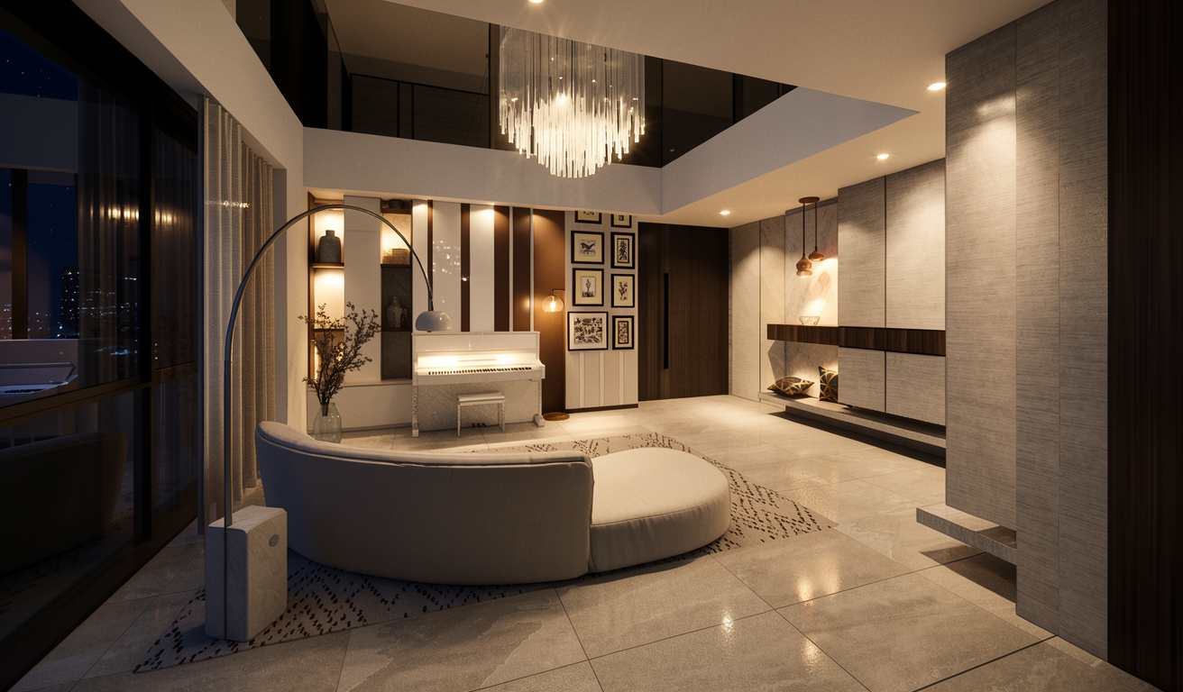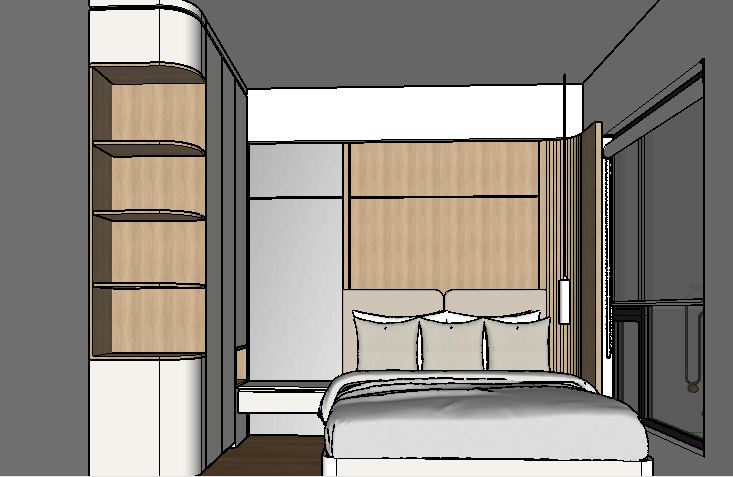 buat gambar ultra realistis tanpa mengubah struktur bentuk desain atau material apa pun jangan mengubah ukuran jpeg dinding warna off white dan plafond warna putih tambah lampu spot light di plafond dan tambah indirect light di setiap rak ambalan dan jangan ubah material warna dan bentuk