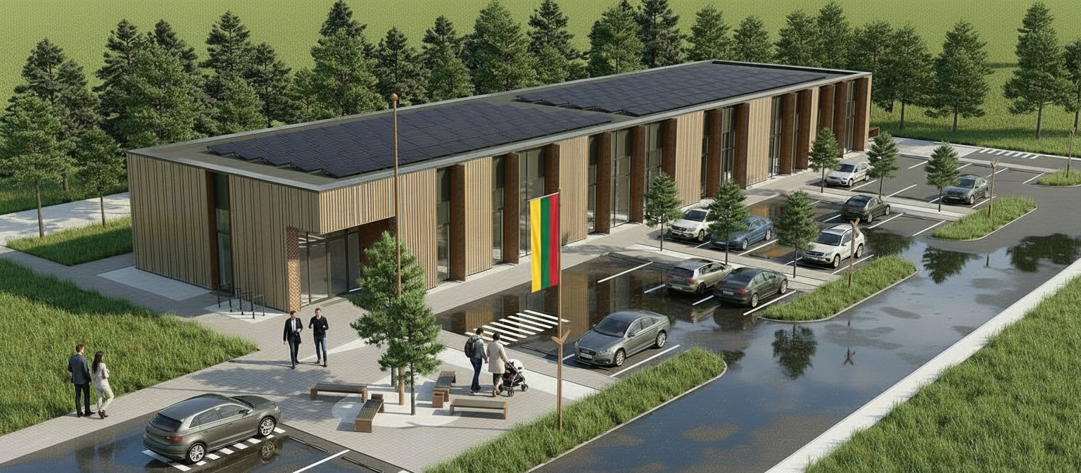 exterior shot do not change the photo and keep everything as shown only add 15 walking people on the sidewalks in the photos in the middle and on the left on the flagpole hang a non fluttering lithuanian flag architecture