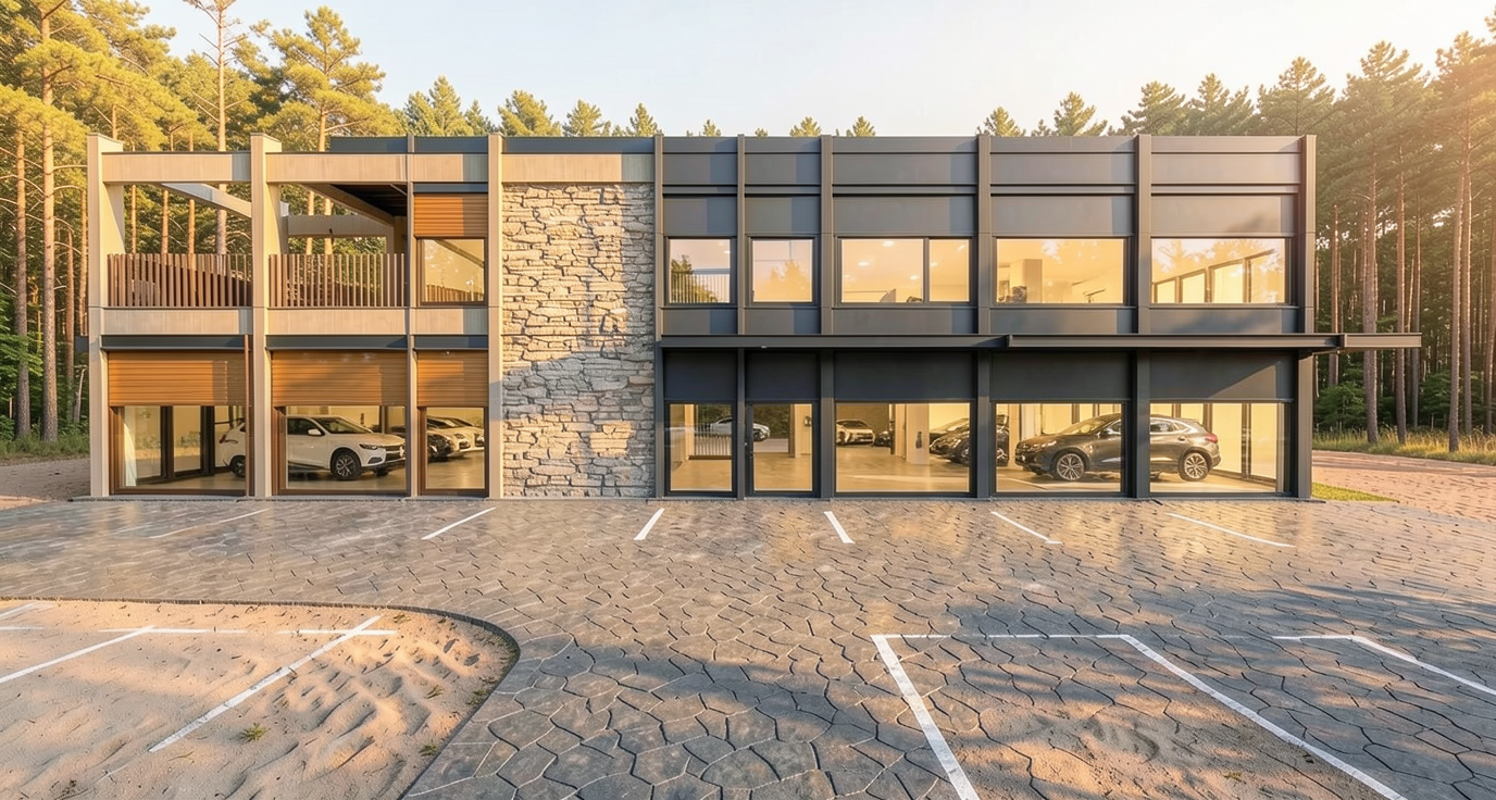 left part is double floor appartment right autosalon light up change window frames to antracite