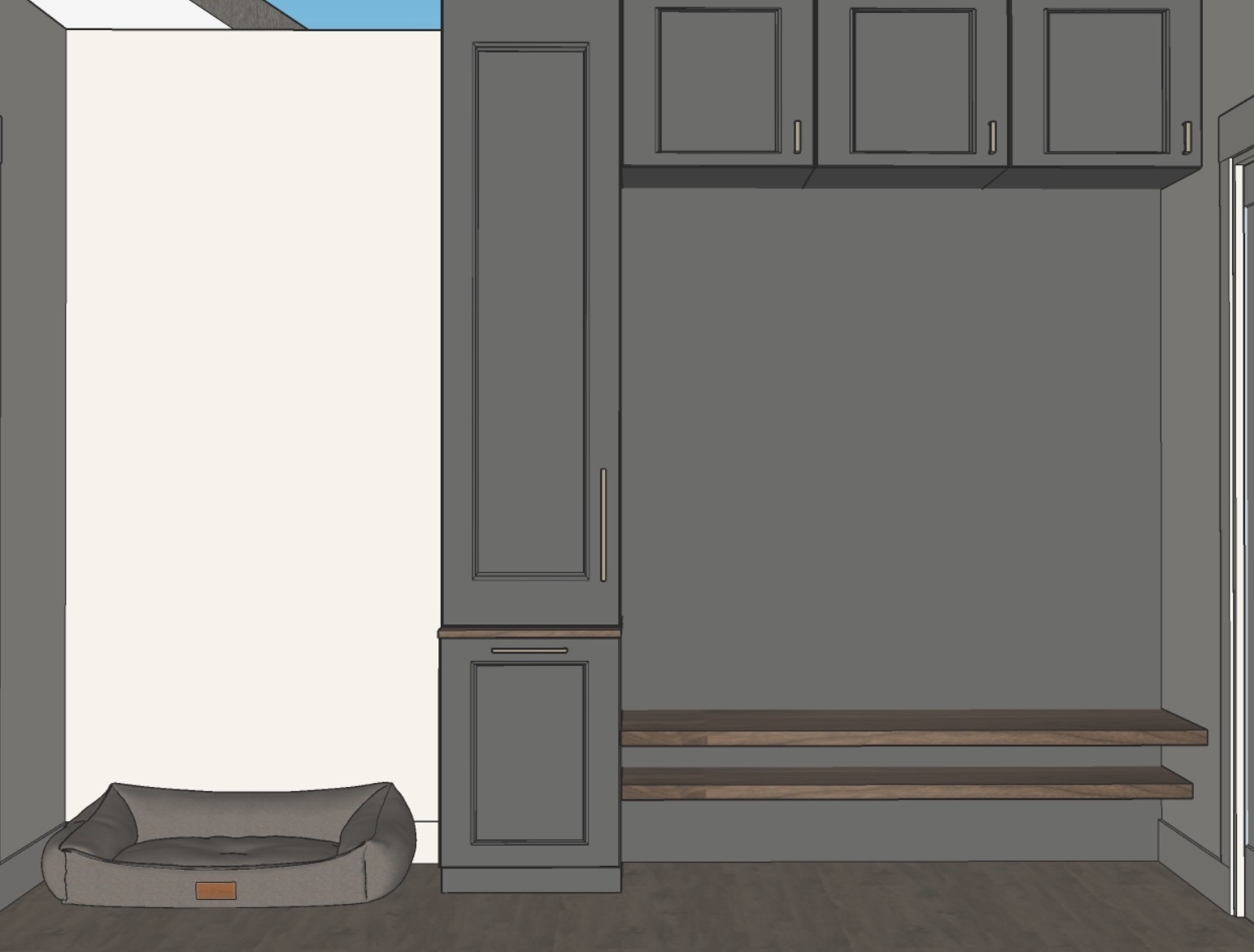 please render this mud room there is no natural lighting add coats hanging shoes under bench and a dog in the dog bed