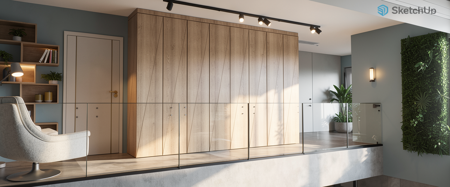 add open shelves next to the door in big wardrobe with desk under the shelves