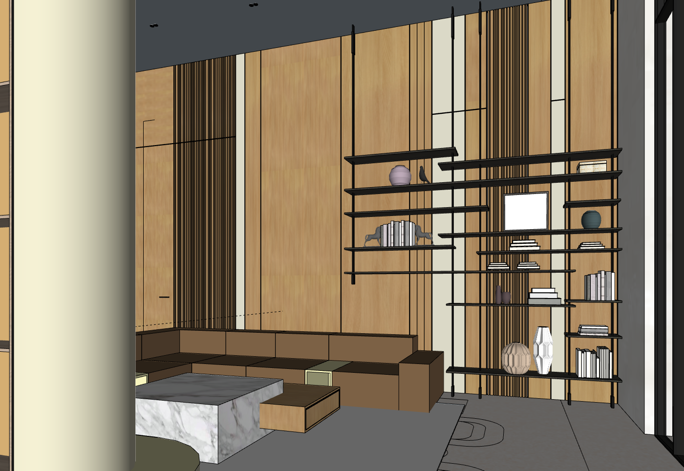 add two armchairs light colored on the right side of the seating area and a floorlamp on the left behind the sofa