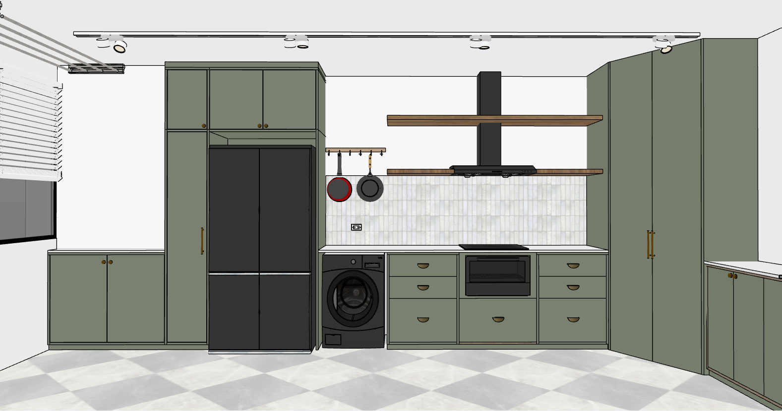 a modern kitchen with a minimalist design featuring sage green cabinets with brass handles the backdrop is a clean white wall with a subtle texture the kitchen has a black refrigerator and washer creating a striking contrast a sleek black range hood is mounted above the stove complemented by warm wooden shelves the backsplash is adorned with semigloss subway tiles for a classic touch the floor consists of light grey and white checkered tiles natural light pours in from a window with white blinds enhancing the fresh ambiance the overall atmosphere is airy inviting and contemporary