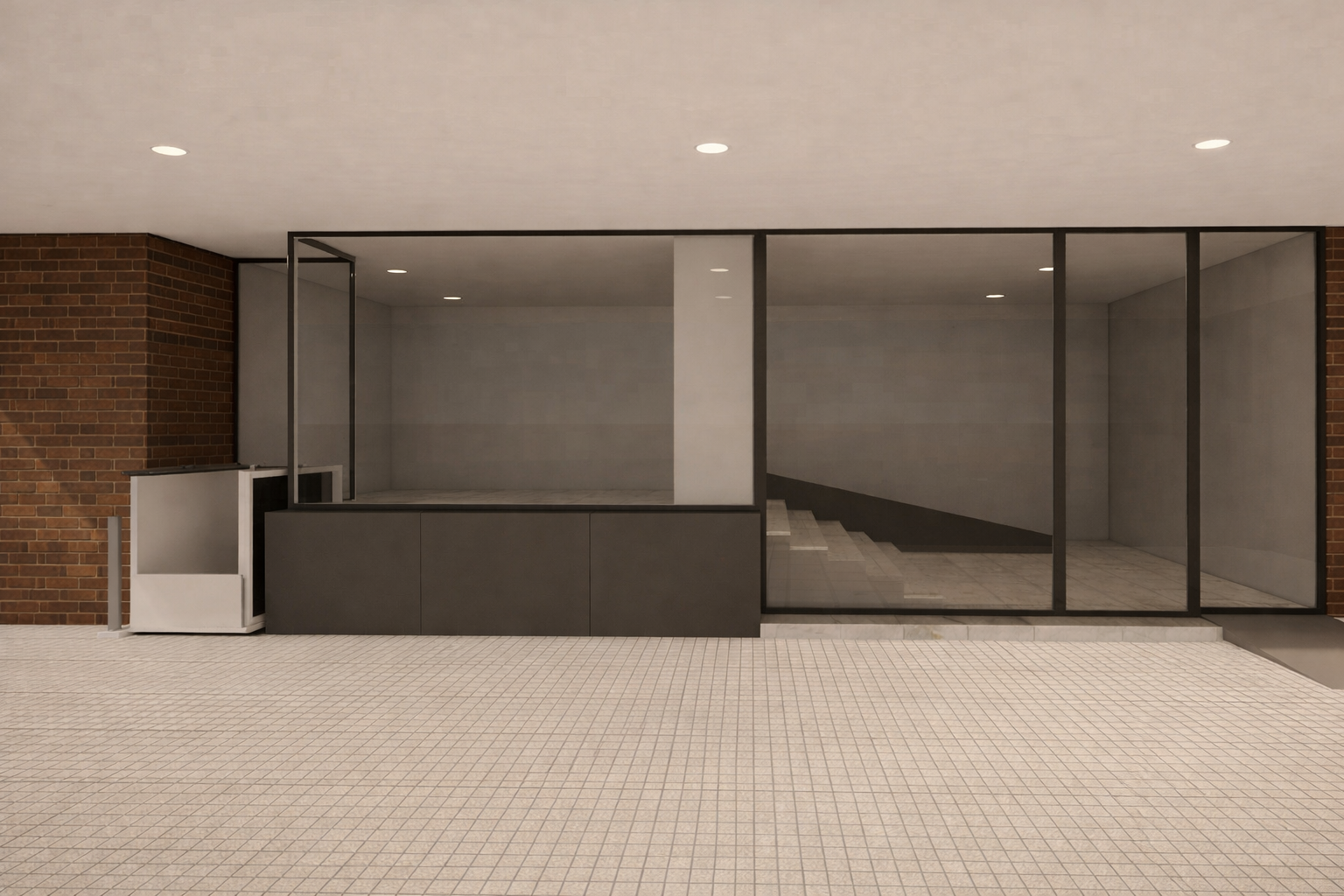 absolute rules do not change architecture do not modify geometry or proportions do not redesign materials do not change camera angle keep all current materials goal transform this render into a photorealistic architectural photograph lighting warm recessed ceiling lights at 3000k physically accurate global illumination soft realistic shadows under overhang subtle bounce light from floor onto facade balanced exposure no blown highlights slight natural contrast increase floor add subtle dirt variation between tiles slight edge darkening in grout lines micro surface roughness very soft reflection at grazing angles brick add natural tonal variation per brick slight irregularities and roughness matte ceramic finish subtle shadow depth in joints grey panel slight brushed metal or powder coated aluminum texture very soft reflection from ambient light micro imperfections not perfect cgi smooth glass realistic reflections from exterior environment subtle interior depth visibility slight reflection distortion camera mild depth of field subtle lens realism very slight vignette high dynamic range look