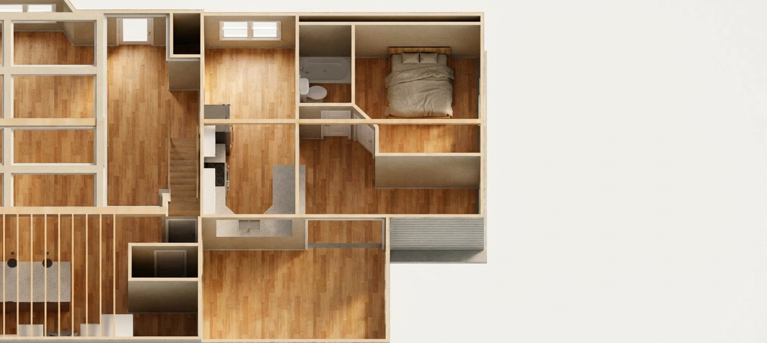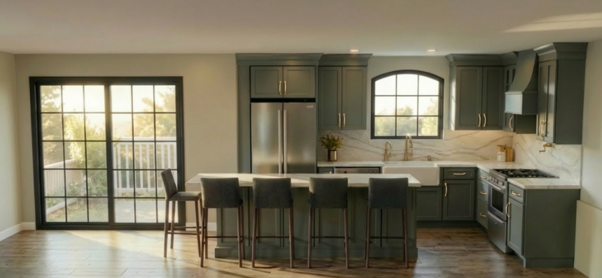 keep everything exactly the same in the rendering do not change the layout cabinet color walls floor lighting appliances windows countertop backsplash or island just make the sliding door on the left have no grids in the glass and the molding to be white do not change anything else make the final image look like a realistic photo rendering with natural lighting and soft shadows