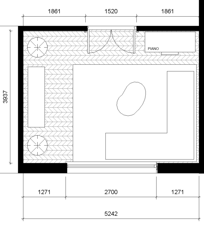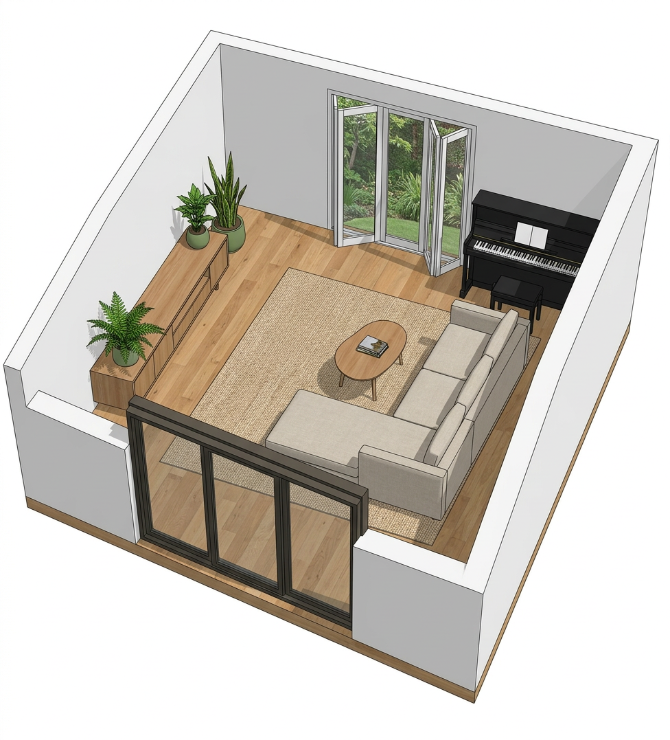 convert this floor plan into a minimalist isometric 3d view of a living room show the space from an elevated angle with furniture walls and details visible black piano straight timber lay floorboards natural beige rug light beige fabric sofa timber coffee table two plants in green pots timber entertainment unit use the same furniture as shows on the plan do not change the orientation of the floorplan