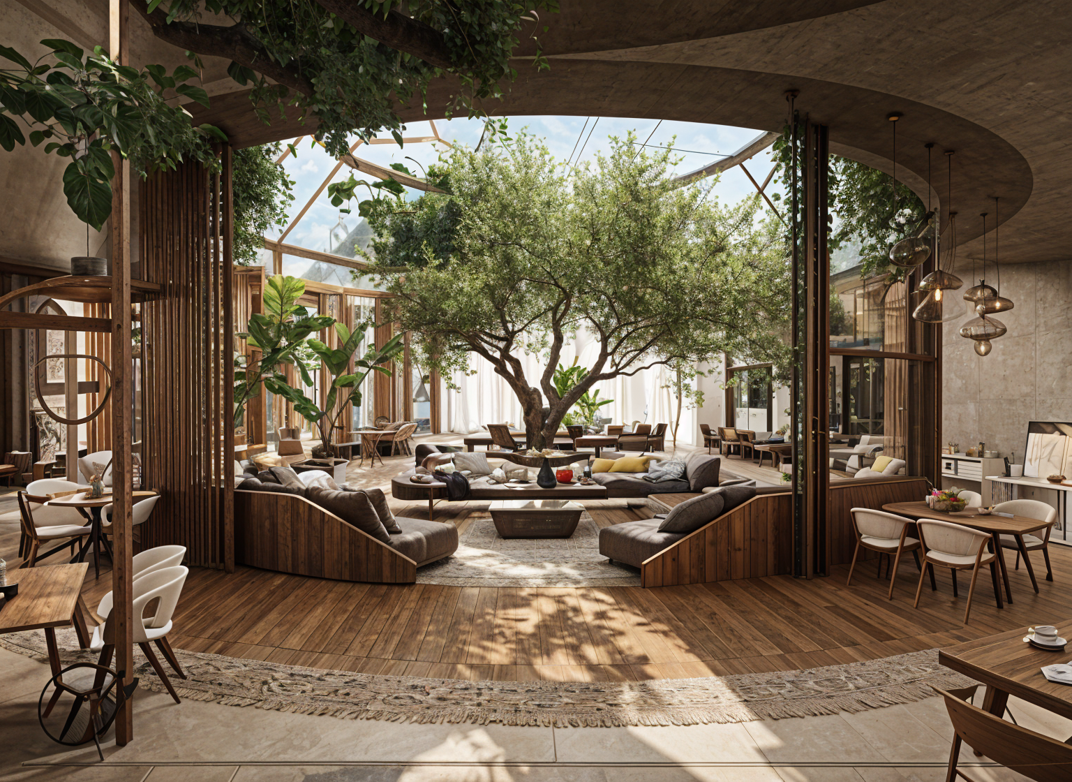 sarineen aerial shot make it look like a rendered design nature wooden earthy colour and design with flowy curved lines architecture