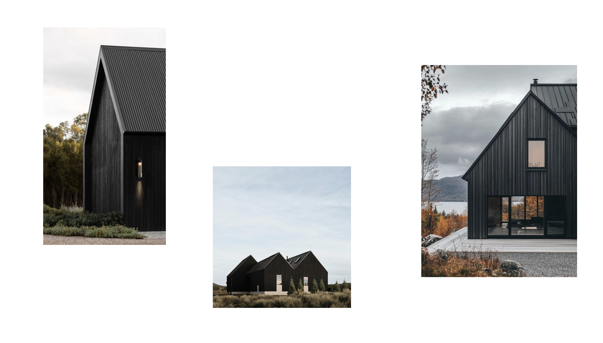 modern scandinavian black barn house exterior shot high pitched roof muted cloudy sky 2 gum trees behind house limestone pathway to front house
