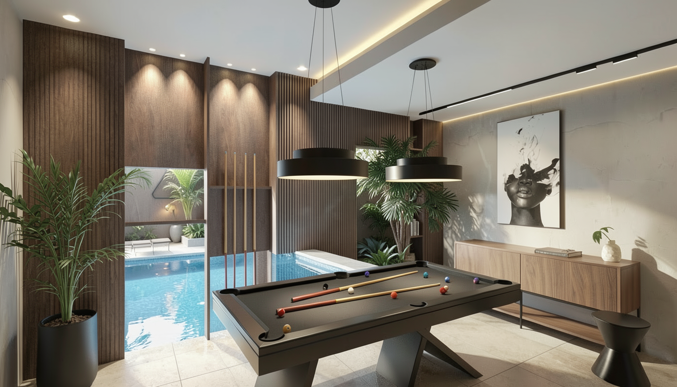 a hyper realistic interior of a media and gym area inside a villa with atmosferic lighting