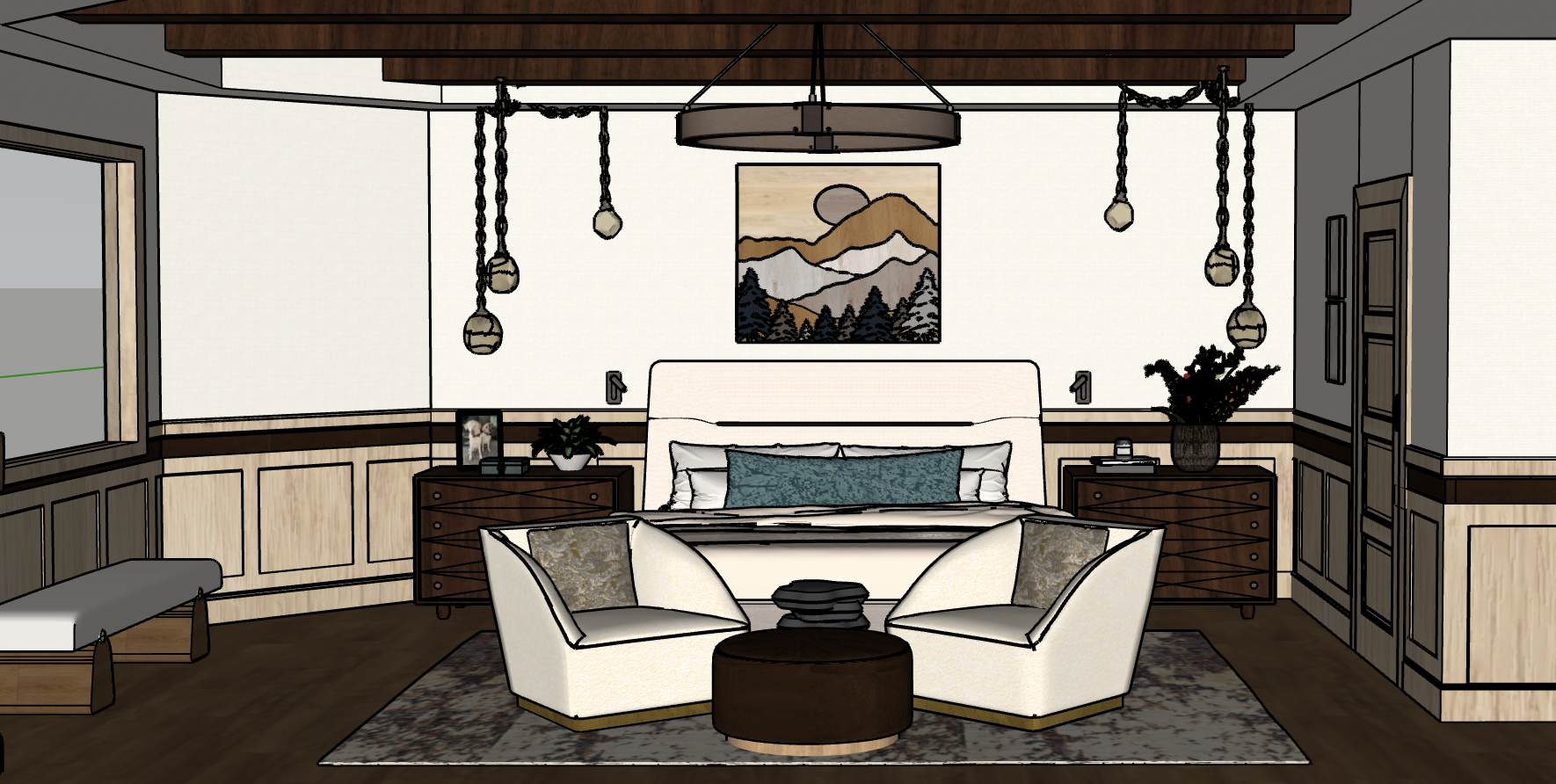 a cozy sophisticated bedroom with a lake tahoe mountain themed large art piece the atmosphere is warm and inviting with rich wood tones and textures the bed features a cream colored headboard and is adorned with teal accent pillows two plush ivory armchairs with patterned pillows surround a round brown ottoman on a multicolored patterned rug dark wooden side tables flank the bed topped with elegant decor elements walls are painted in soft neutrals while the ceiling showcases exposed dark wooden beams the overall lighting is warm and ambient enhancing the comforting atmosphere the chandelier is made of brown glass lit with led lighting