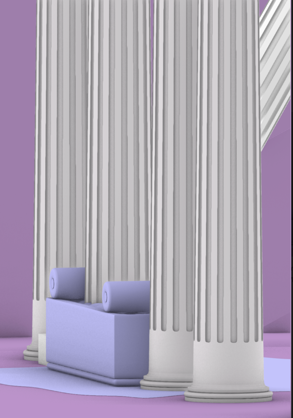 exterior shot purple fur keep exact same angle and structure only fur walls and floor no other material realistic columns pillars to look like tghe image in the mood board