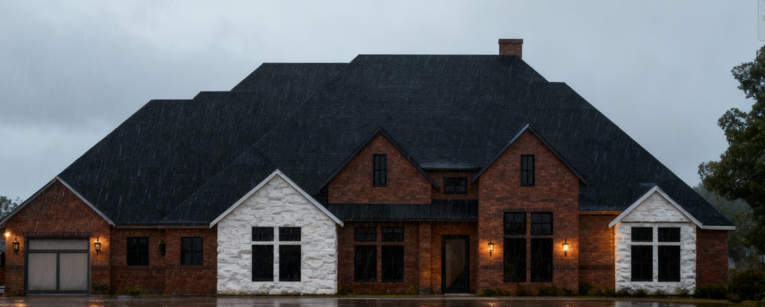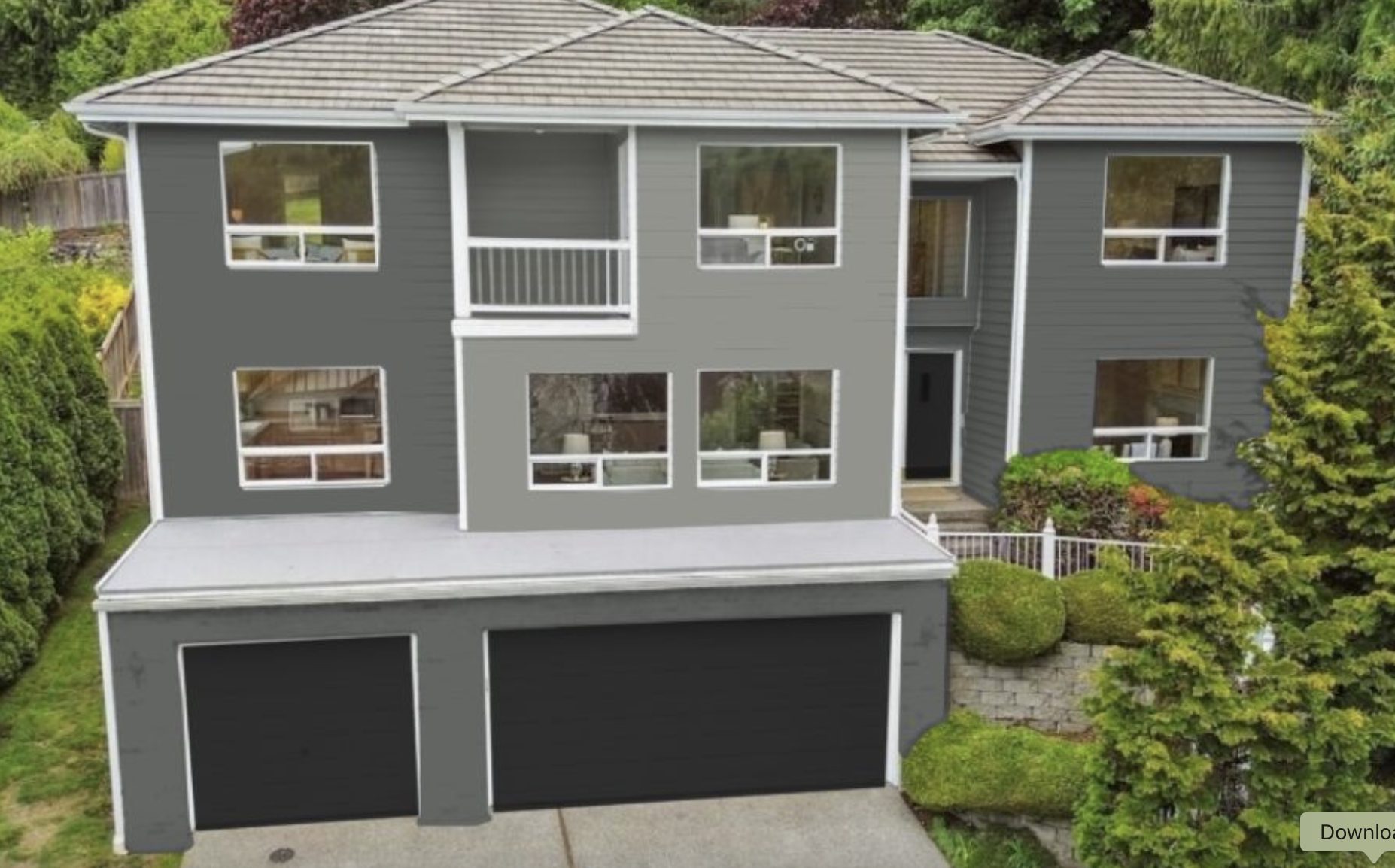 a modern suburban house with a sleek sophisticated design the exterior walls are painted in a rich slate gray complemented by crisp white trim and window frames the roof is a light taupe providing a subtle contrast against the darker walls lush green trees and shrubs surround the house enhancing its inviting and tranquil atmosphere the driveway and pathways are constructed of smooth light gray concrete the overall mood is peaceful and upscale with natural light reflecting softly off the surfaces