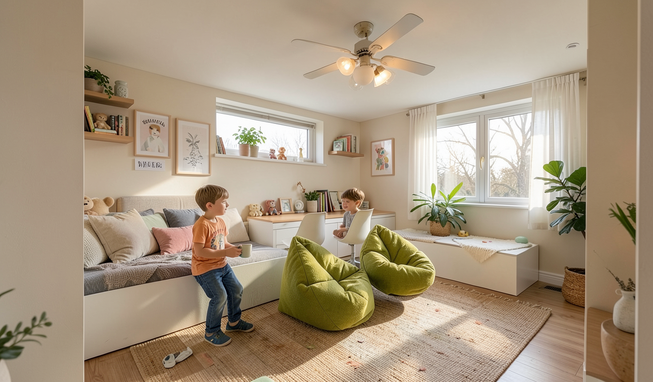 room for two boys 10 yaers old there are tables beetween beds up the table is bookcase