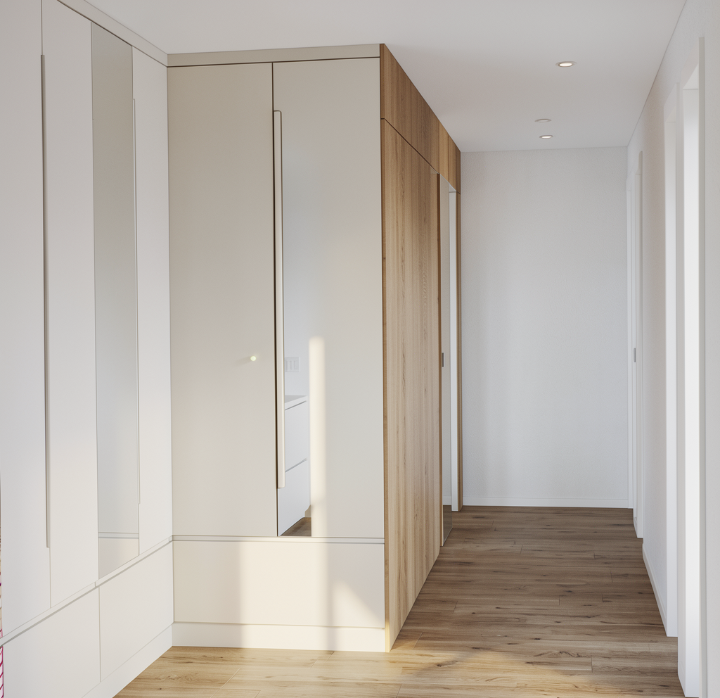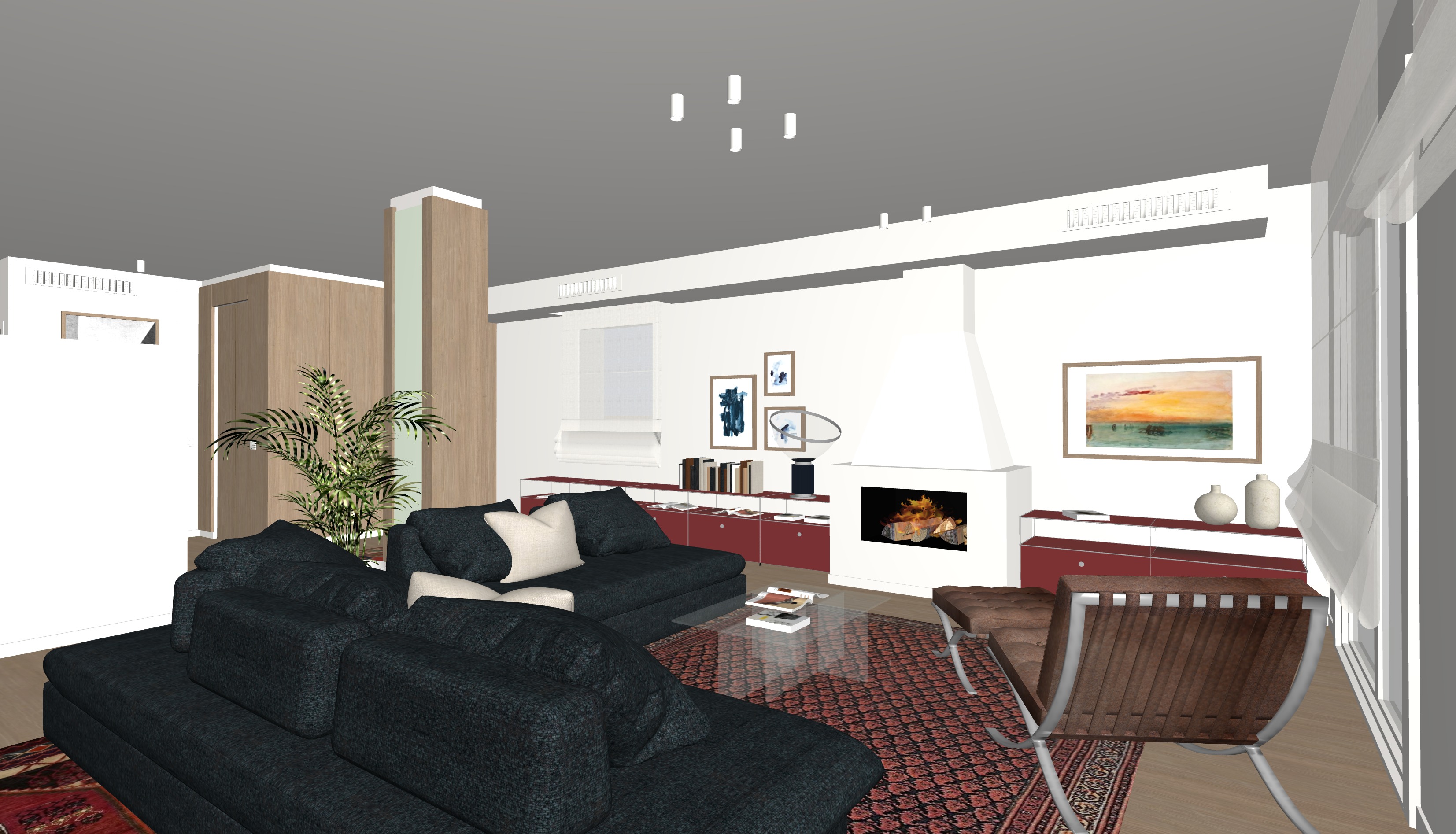 accendi il camino e accendi i faretti bianchi a soffitto non ci sono strip led che illuminano la stanza le pareti e il soffitto sono tinteggiate in bianco caldo la colonna e la parete dell ascensore hanno delle boiserie in legno rovere naturale liscio a terra abbiamo un parquet in rovere naturale sulla colonna dietro alla pianta c uno specchio fai entrare della luce naturale dalle finestre