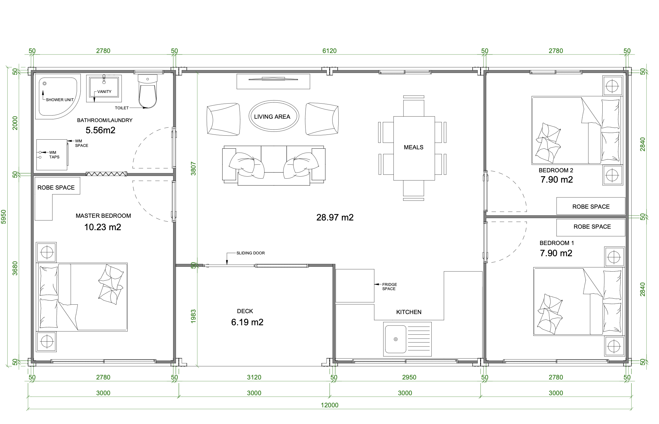 convert this floor plan into a realistic isometric 3d view of a full house show the space from an elevated angle with furniture walls and details visible create a detailed isometric 3d render from this architectural floor plan of a compact modern home maintain the exact layout and proportions style modern minimal realistic camera isometric axonometric view top down at 30 45 angle structure single storey rectangular house materials walls light neutral plaster off white floors light timber flooring in living bedrooms bathroom light grey tiles kitchen white cabinetry with stone benchtop furniture match plan layout living 3 seat sofa 2 armchairs coffee table dining 6 seat table centered kitchen l shaped counter with sink and fridge bedrooms double beds with side tables and robes bathroom shower vanity toilet laundry area include doors windows sliding door to deck deck small outdoor timber deck connected to living area lighting soft natural daylight subtle shadows remove roof to show interior clearly keep proportions accurate and uncluttered use the same furniture as shows on the plan do not change the orientation of the floorplan