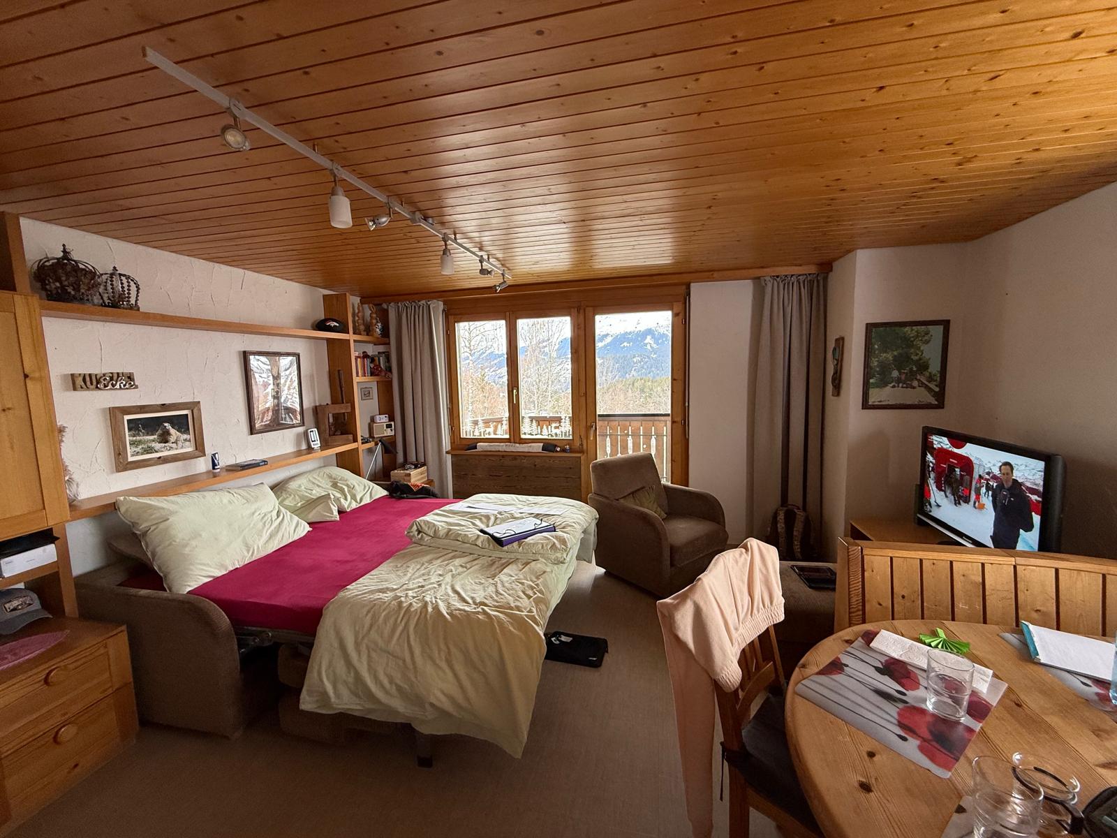 fotorealistisches innenraum foto exakt dieselbe perspektive und kameraposition wie das hochgeladene referenzbild 100 identische raumgeometrie exakt gleiche m belanordnung exakt gleiche fensterpositionen und gleicher ausblick durch die fenster weiches nat rliches tageslicht leicht schr g einfallende sonne durch die grossen fenster sanfte realistische schatten realistische materialien echte holztexturen stoff mit leichten gebrauchsspuren hochwertige oberfl chenreflexionen wohnzimmer komplett im alpenchic gestalten komplett neuer look alle m bel linke seite ersetzen fenster mit altholz auf ganzer breite ausstatten oben im altholz lichtkranz ausbilden optimal ausleuchten decke weissputz linke seite modernes loungesofa dar ber ein schrankm bel mit tablaren und indirektes licht zur decke hin rechte seite esstisch und eckbank belassen tv rechts an wand auf sideboard hingestellt und abdrehbar tv eingeschalten mit netflix logo grosse h ngeleuchte ber dem esstisch bodenlange beige nachtvorh nge boden ersetzen mit grossen platten valsergranit runder beiger teppich unter sofa kleine bilder an der wand canon eos r5 35 mm festbrennweite f 2 8 nat rliche farbwiedergabe leicht warme farbstimmung golden hour feeling hyperrealistisch dslr qualit t raw aufnahme 8k aufl sung extrem scharf perfekte tiefensch rfe professionelle architekturfotografie