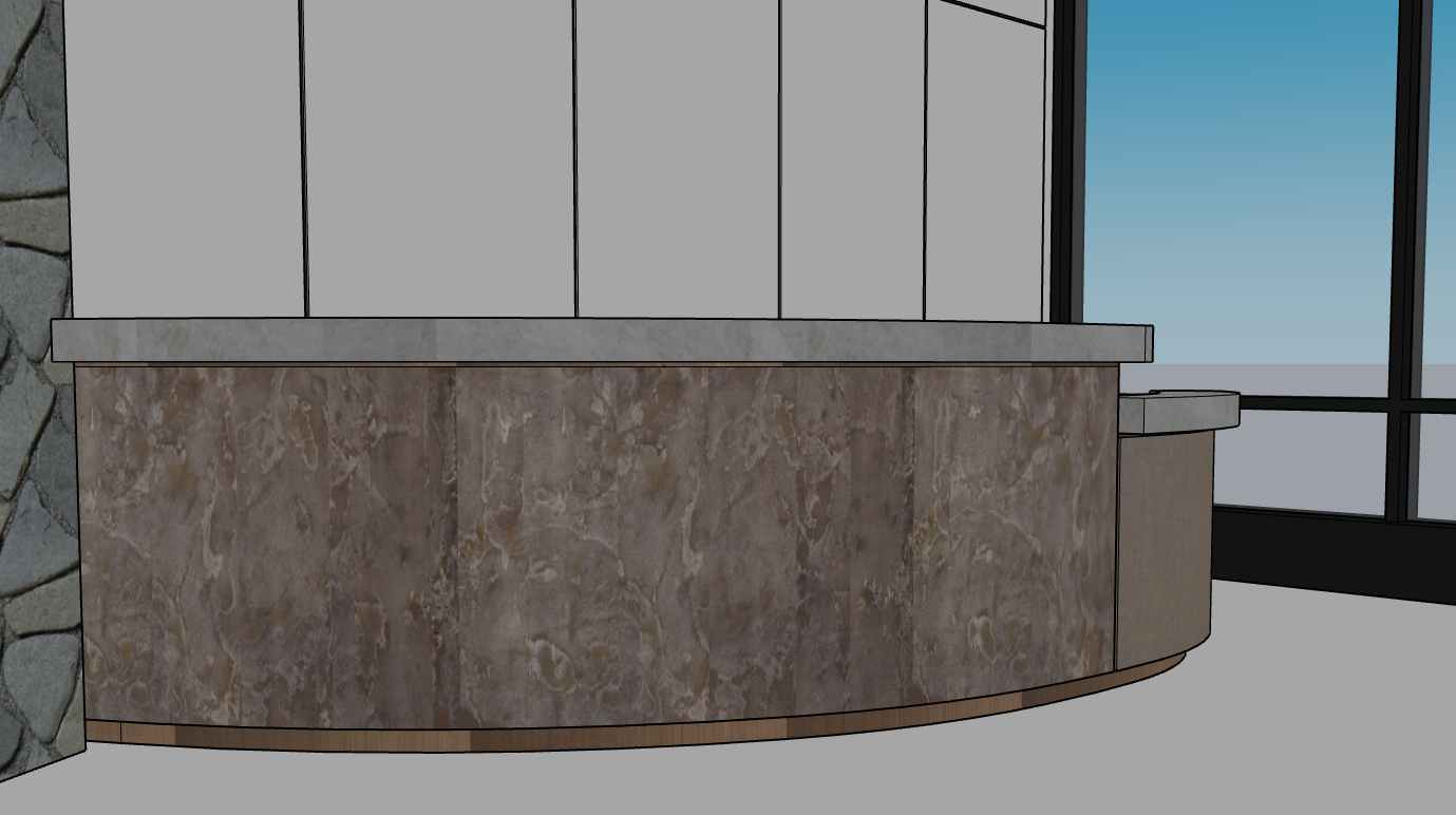 render a modern interior reception desk scene with a honed taj mahal stone counter in a soft gray complemented by a textured bronze front panel in muted earth tones and rift white oak side panel use a sleek dark frame for the window with a lush golf course visible add a natural flagstone wall on one side in varying shades of gray for a rustic touch create a tranquil and inviting atmosphere with diffused natural light gently illuminating the space