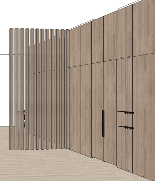 no black handles lines on the left are a slat wooden room separator light comes from the right side of the picture