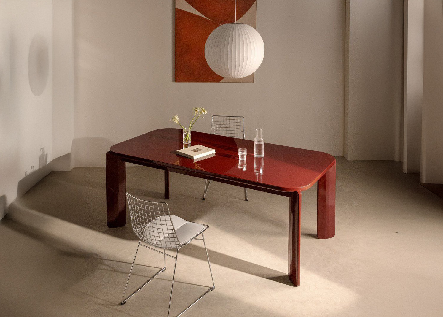 exterior shot a colorful timber table in a minimalist interior settings aerial view minimalist and beautiful keep original table design and details