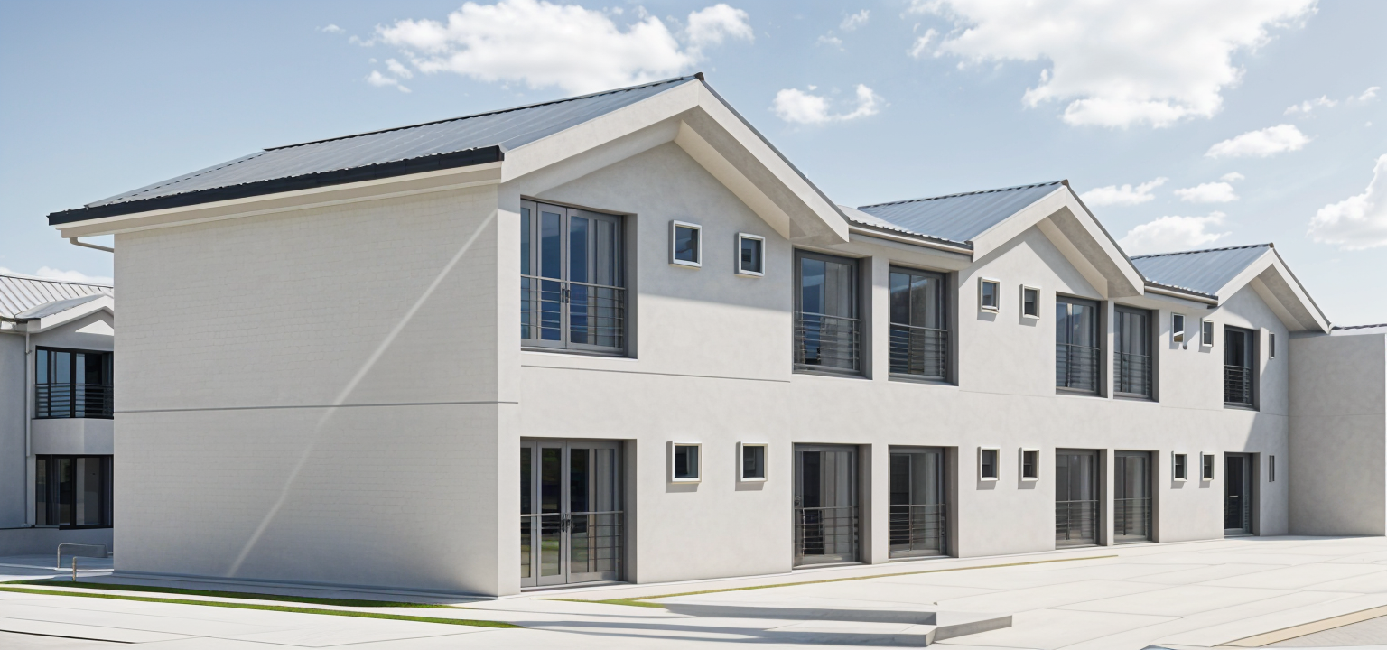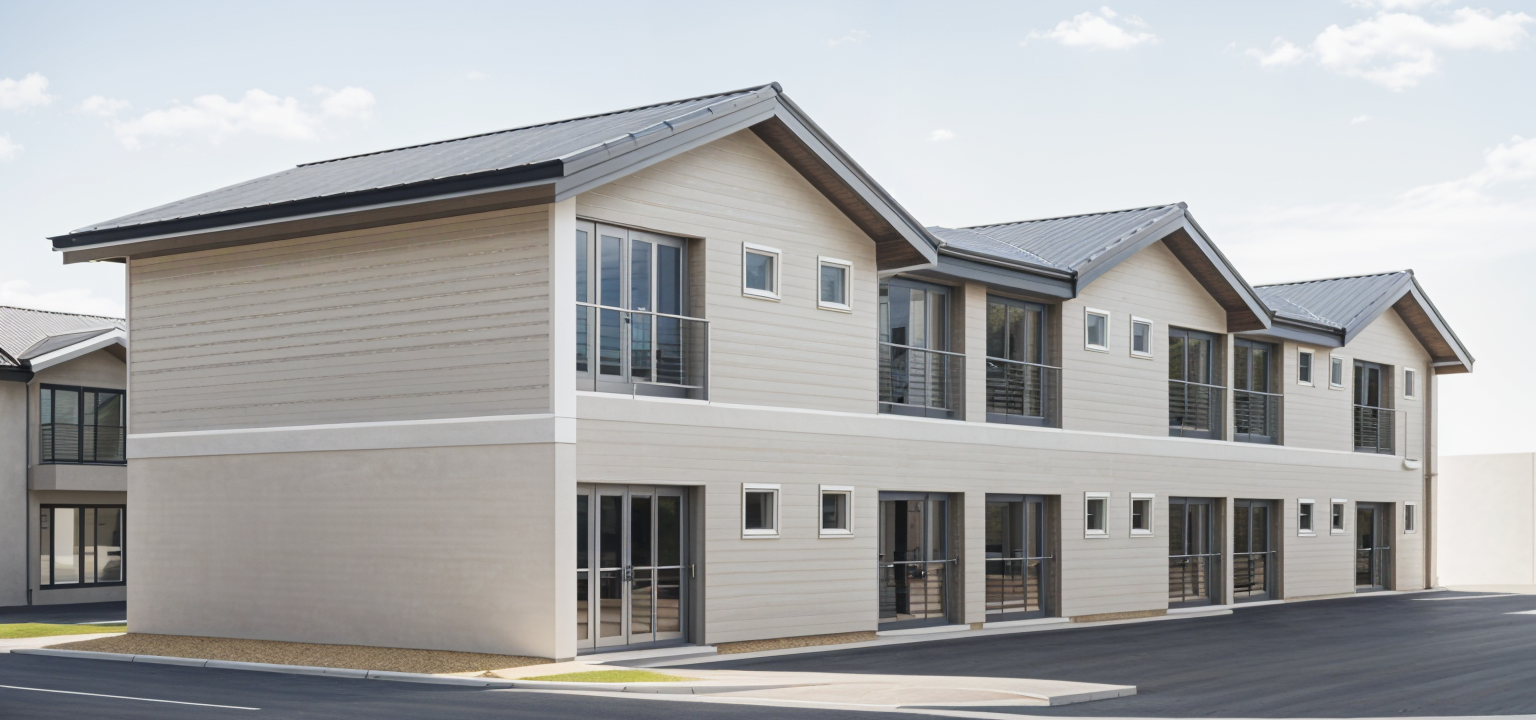 a two story house in brown color with windows in matt black and a red roof on a sunny day