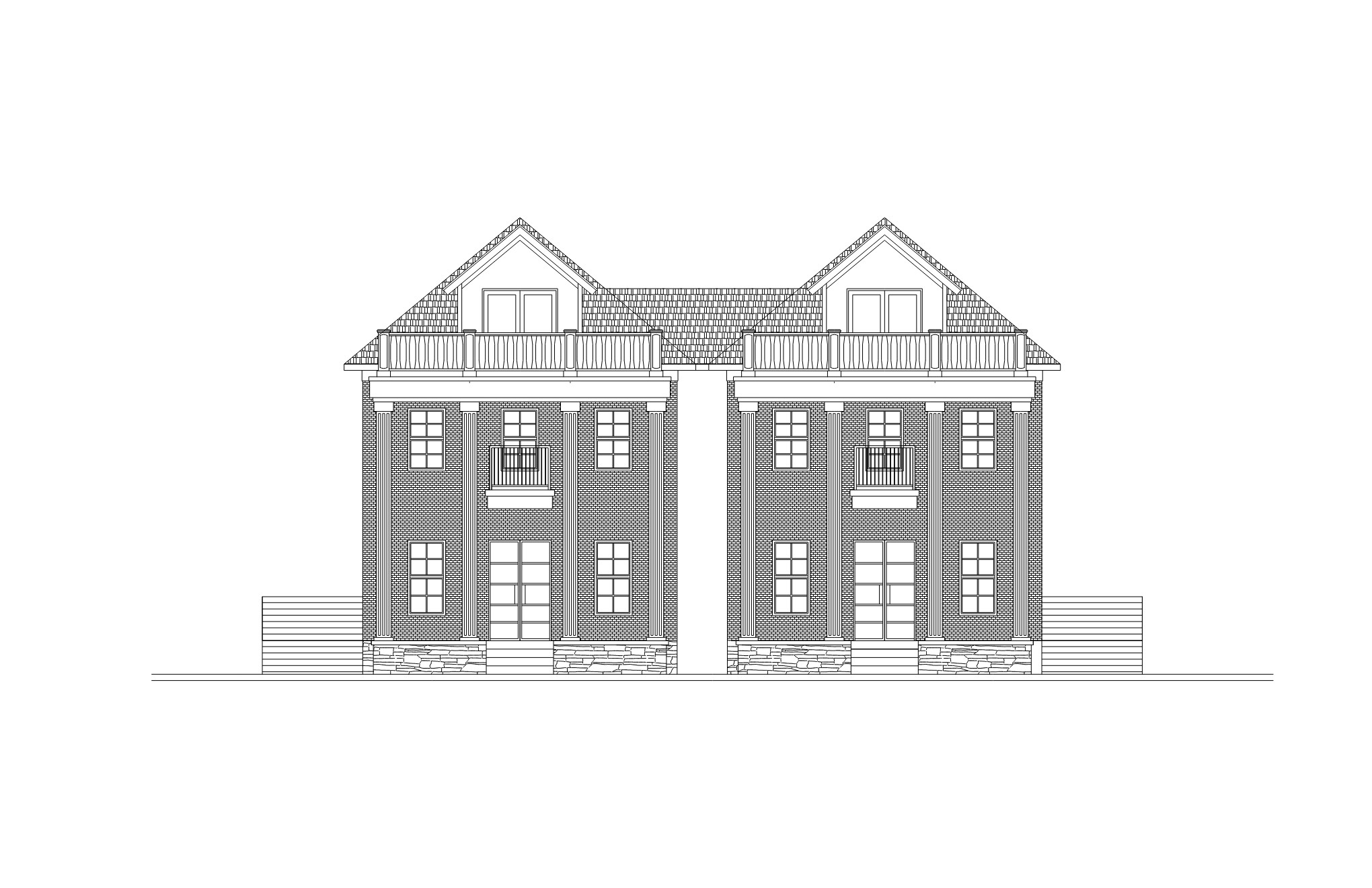 exterior shot can you add a car in front along with a person for scale blue sky and a little landscaping this duplex will be on a round about culdesac along with two others probably not in this shot but the drive to the rear garages are on the left side of this elevation looking at it from this view