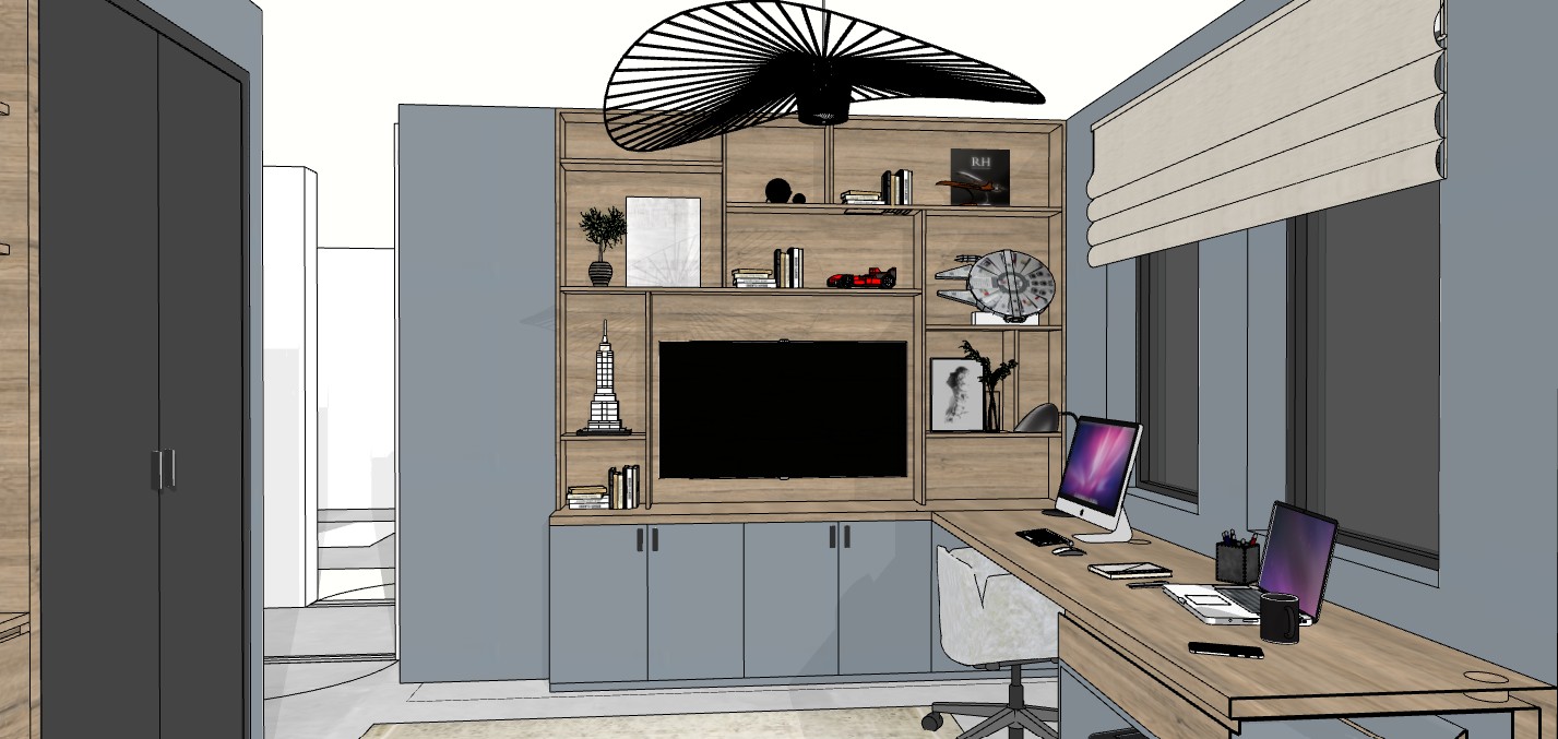 create a modern minimalist home office with a cozy atmosphere the walls are a soothing light blue the cabinetry and shelves are crafted from light wood adding warmth and texture the hanging light fixture is an elegant black geometric design the window features cream colored roman shades filtering in soft natural light the sofa is upholstered in light beige fabric complementing the soft neutral beige area rug design a sleek desk with a modern computer a printer and a black adjustable desk lamp the room feels serene and inviting perfect for productivity and relaxation