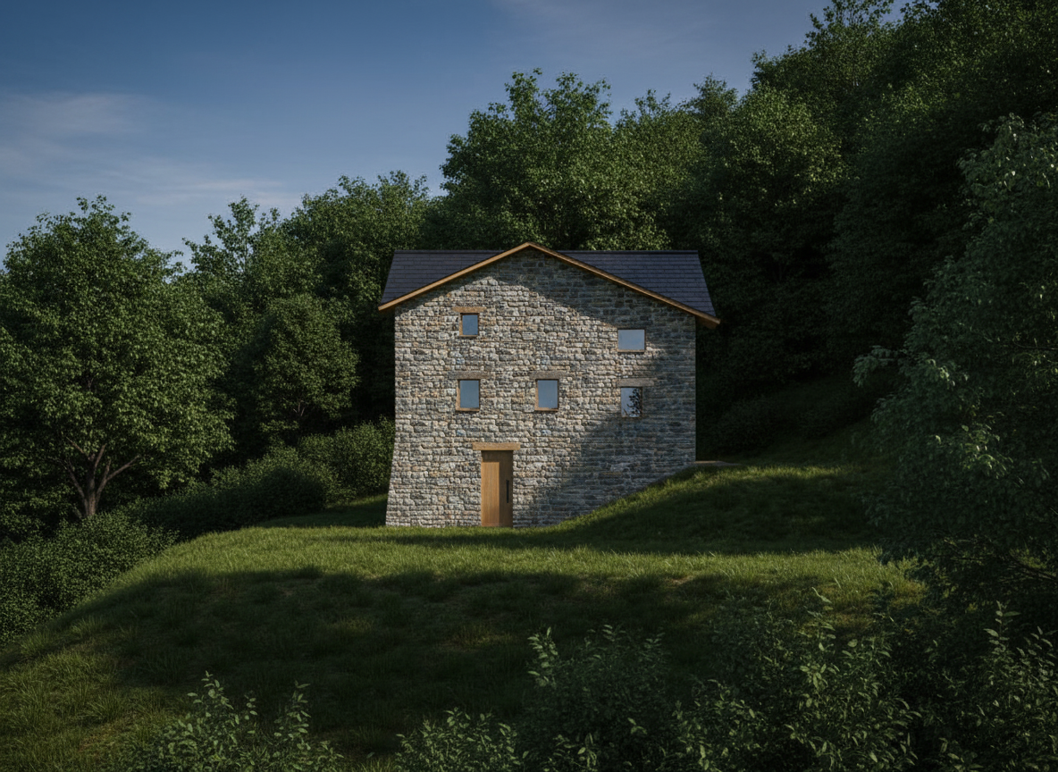 create an architectural elevation of the attached image do not crop or resize the house vertically or horizontally the full elevation must remain visible do not alter the design only apply the materials and fill the exterior with nature the material of the walls are natural rock bricks random mix of grey cream and light brown tones with over grouted mortar the roof is made with dark black slate roof seam the under roof beams are mad of oak wood the gaps in the wall are all windows with glass the exterior is all greenery all around the structure the ground is full of with grass and the upper part of the background with a steep hill side full of trees keep it subtle and soft not overpowering preserve all existing windows keep the overall rendering slightly on the darker moody side for realism