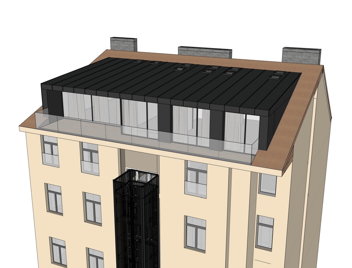 roof brick color folded tile superstructure material black sheet metal reflections in the windows glass railing lots of greenery on the terrace