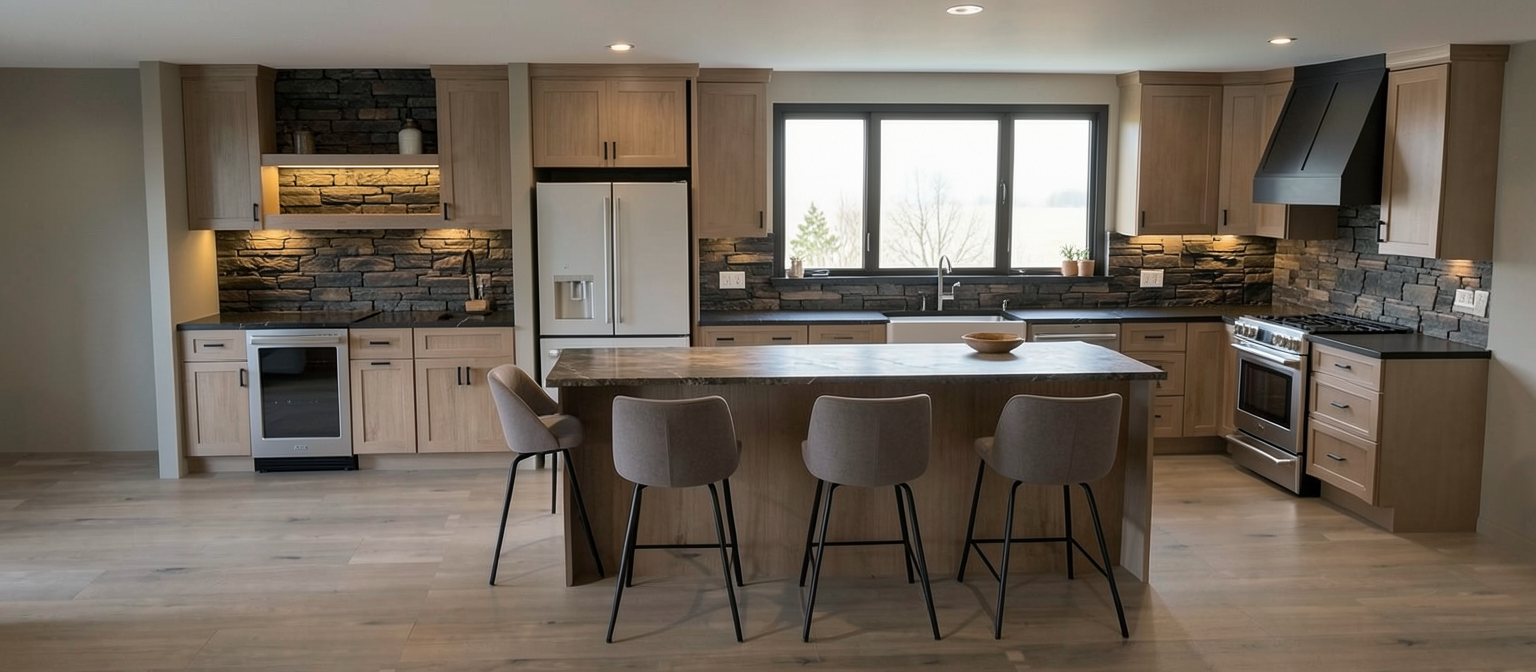 add flowers on the island moody light do not change cabinets nor add open shelves light inside class cabinets on the back wall above the tall cabinets light inside the glass cabinet on the island