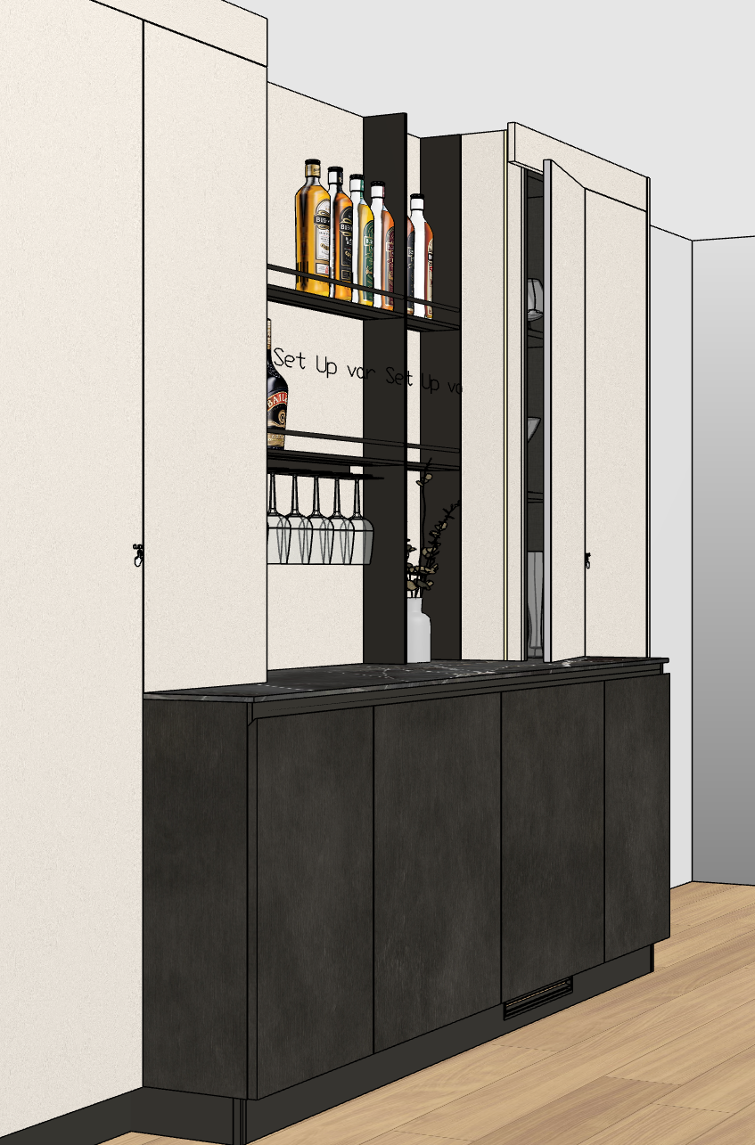 no led lights no linear lights no strip lights no cabinets lights no shelves lights keep original finishes brush dark steel for the bases and beige plaster for the tall units and back panels behind the metal shelves countertop is matt the inside of the cabinets is anthracite linen