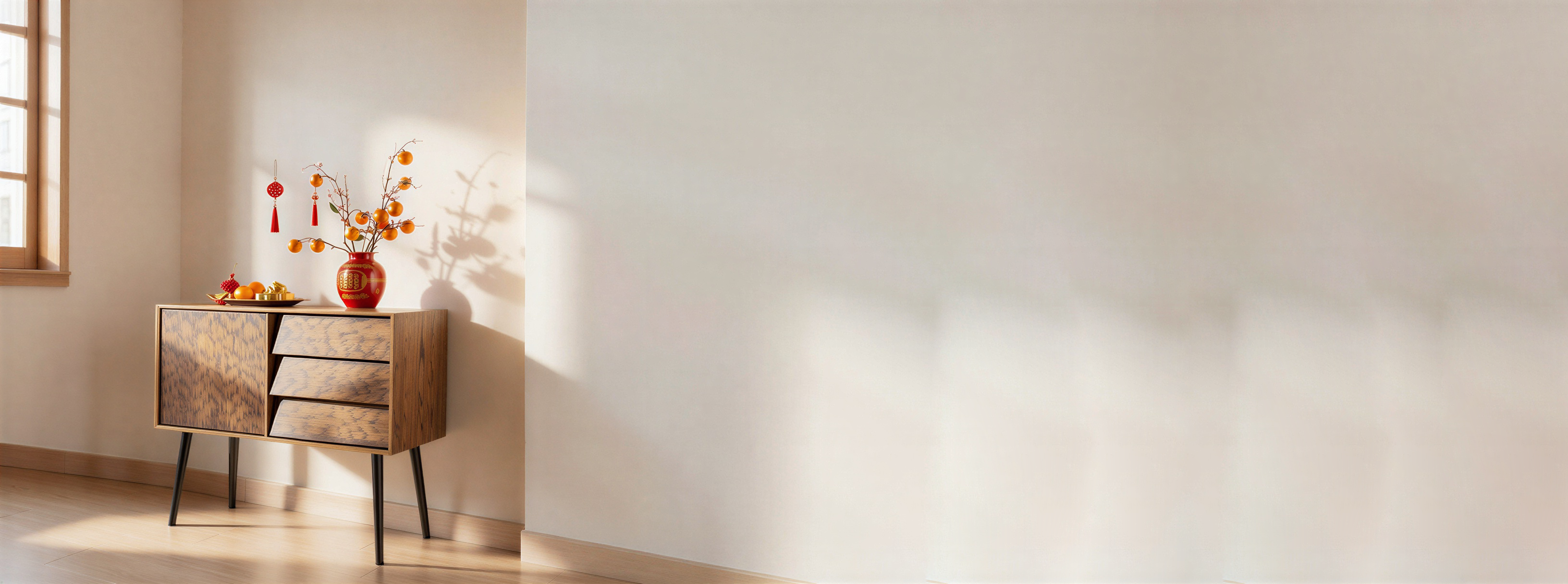 modify the background wall so it becomes a flat clean continuous wall surface with no columns no indents no protruding corners and no architectural breaks the wall should look smooth straight and even creating a minimalist and uncluttered backdrop use a soft neutral wall color such as warm white or light beige remove any visual distractions on the wall and keep it clear and empty maintain natural soft daylight with realistic shadows and reflections consistent with an indoor living space ensure lighting remains cohesive and enhances the wood grain of the sideboard the final result should feel clean modern and showroom ready with strong visual focus on the sideboard against a simple refined wall