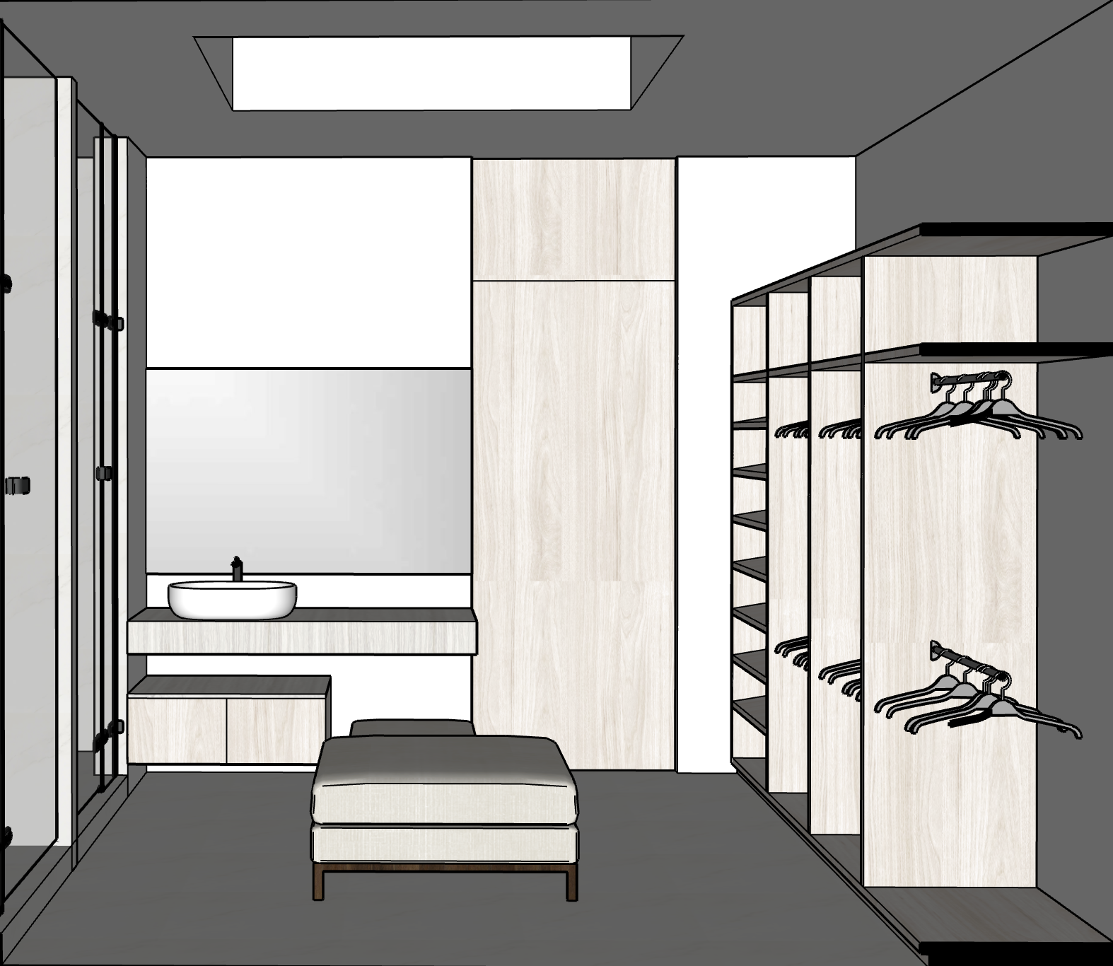 modern minimalist bathroom and walk in closet interior render soft neutral tones with light wood cabinetry matte black fixtures and light gray porcelain tile flooring single vanity with vessel sink and large mirror glass enclosed shower with marble style walls on the left open wardrobe with shelving on the right and a central upholstered bench in beige fabric natural light from ceiling skylight clean lines balanced composition realistic reflections and textures rendered in a warm daylight photorealistic style