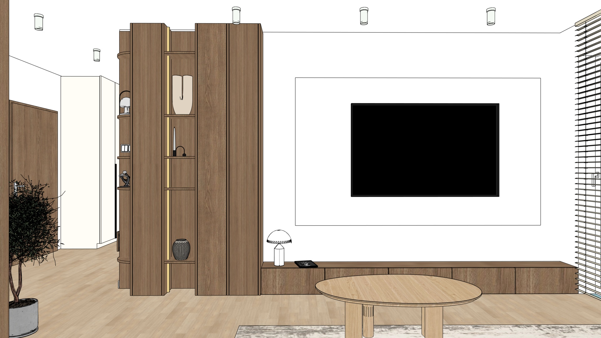 transform the input interior design photo into a hyper realistic architectural visualization of a contemporary modern interior preserve exact geometry layout proportions and material intent from the original design lighting create soft overcast daylight atmosphere similar to a cloudy rainy day without visible rain with diffused natural light entering through windows add warm artificial lighting from all lamps accent led backlighting behind the tv subtle ambient glow to enhance depth and spatial layering maintain balanced contrast no harsh shadows no overexposure materials textures enhance material realism micro details surface imperfections soft reflections accurate roughness physically correct light response emphasize textures wood grain fabric weave stone concrete metal and matte finishes high micro contrast and tactile depth rendering style ultra photorealistic architectural visualization cinematic quality natural color grading neutral tones soft highlights realistic global illumination physically based rendering high dynamic range premium interior photography style camera composition wide angle architectural lens natural perspective eye level viewpoint deep focus sharp details across the frame natural framing no distortion atmosphere calm elegant contemporary premium residential mood clean minimal refined without visual noise output 8k resolution ultra detailed noise free crisp edges professional architectural rendering quality negative prompts no rain droplets no lens flares no fog no haze no bloom no motion blur no cartoon no stylization no oversharpening no artificial glow no unrealistic reflections no distortion no clutter
