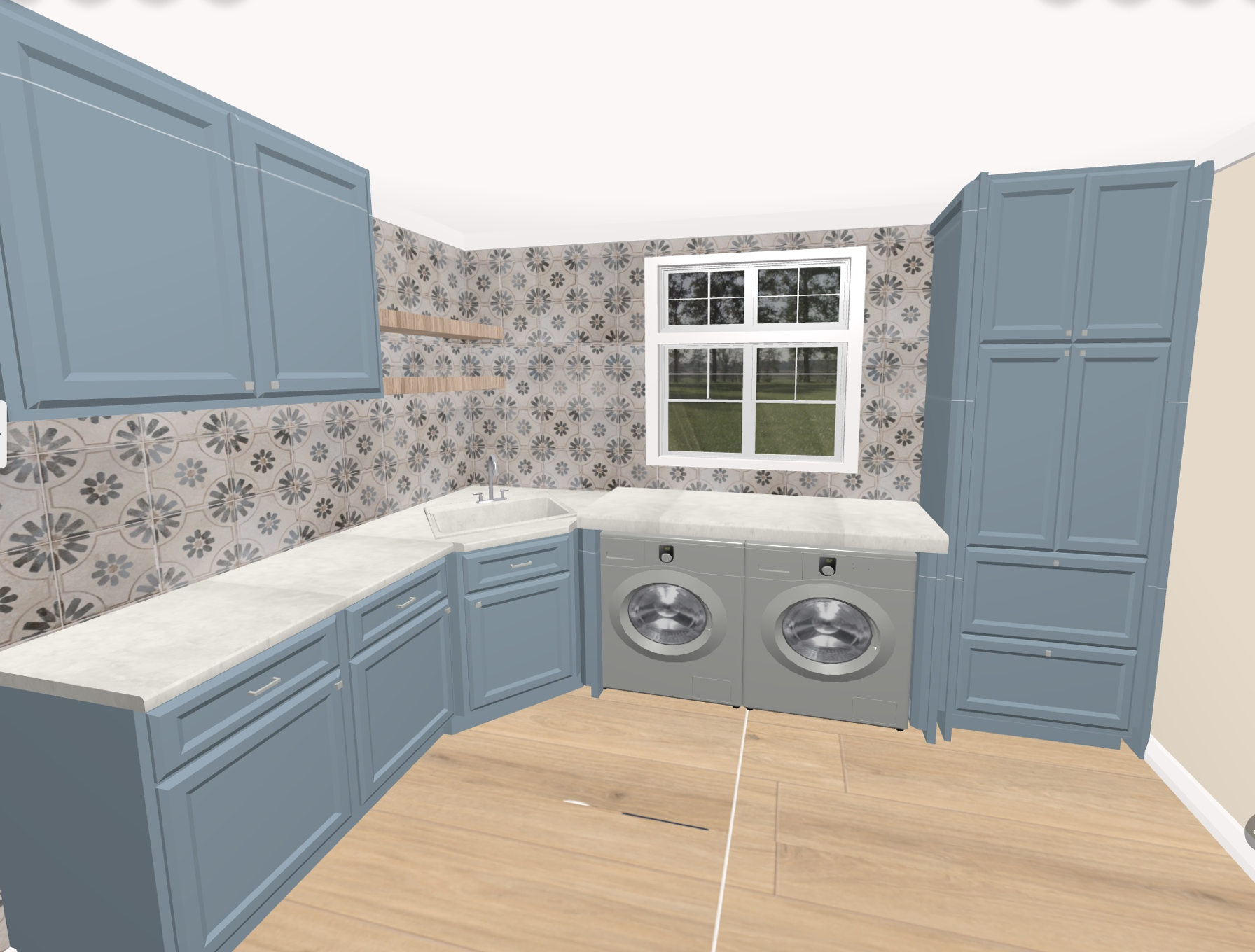 this bright french country modern laundry room is filled with natural light the blue cabinets are accented by the blue in the handmade tile backsplash warm natural quartz countertops create a cohesive space for folding clothes while the corner sink optimizes counter space the warm oak floating shelves are a perfect plants and decor upper cabinets and floating shelves are underlit with warm recessed lights