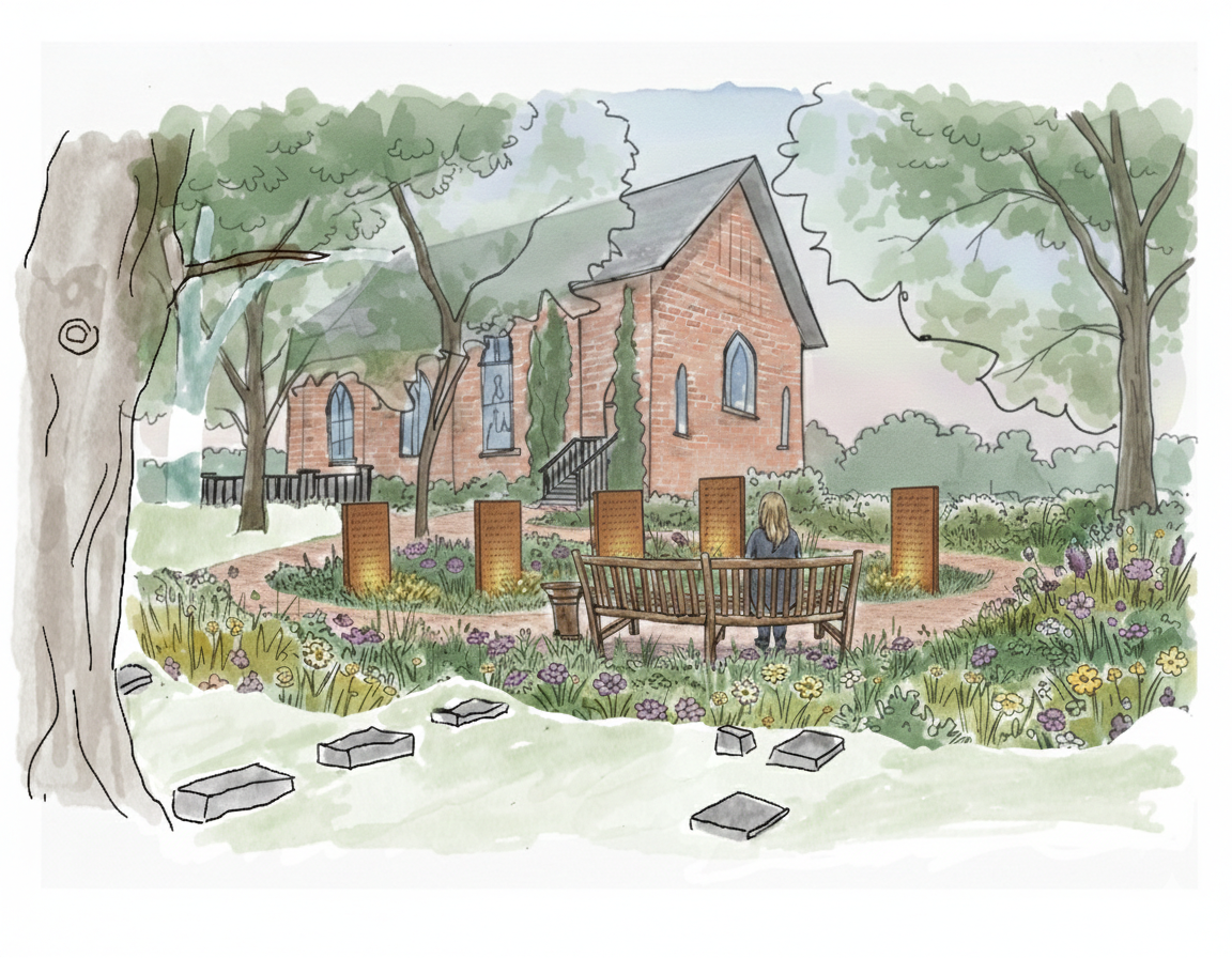 generate a watercolor style illustration using this annotated image as a strict layout guide follow all marked arrows and constraints exactly the brick path must remain entirely in the background running left to right as indicated and must not enter the foreground the bench must sit on a widened paved eddy that is part of the same continuous brick surface as the path do not create isolated paving islands loops or foreground paths preserve the memorial markers along the path and the contemplative garden atmosphere refine this image into a more seamless unified watercolor style rendering while preserving all existing geometry and object placement exactly as shown do not move resize add or remove any elements do not alter the location or direction of the path bench memorial markers gravestones church trees or plantings maintain the bench in the foreground the memorial markers in the background along the path and the meandering left to right path exactly as depicted improve visual continuity by softening edges harmonizing textures and unifying color tones across plants paving and architecture enhance the watercolor qualities gentle washes subtle line work and consistent light so the scene reads as a single cohesive illustration rather than layered elements preserve the contemplative reverent mood and the legibility of the memorial markers and poem engravings this is a rendering refinement only not a redesign