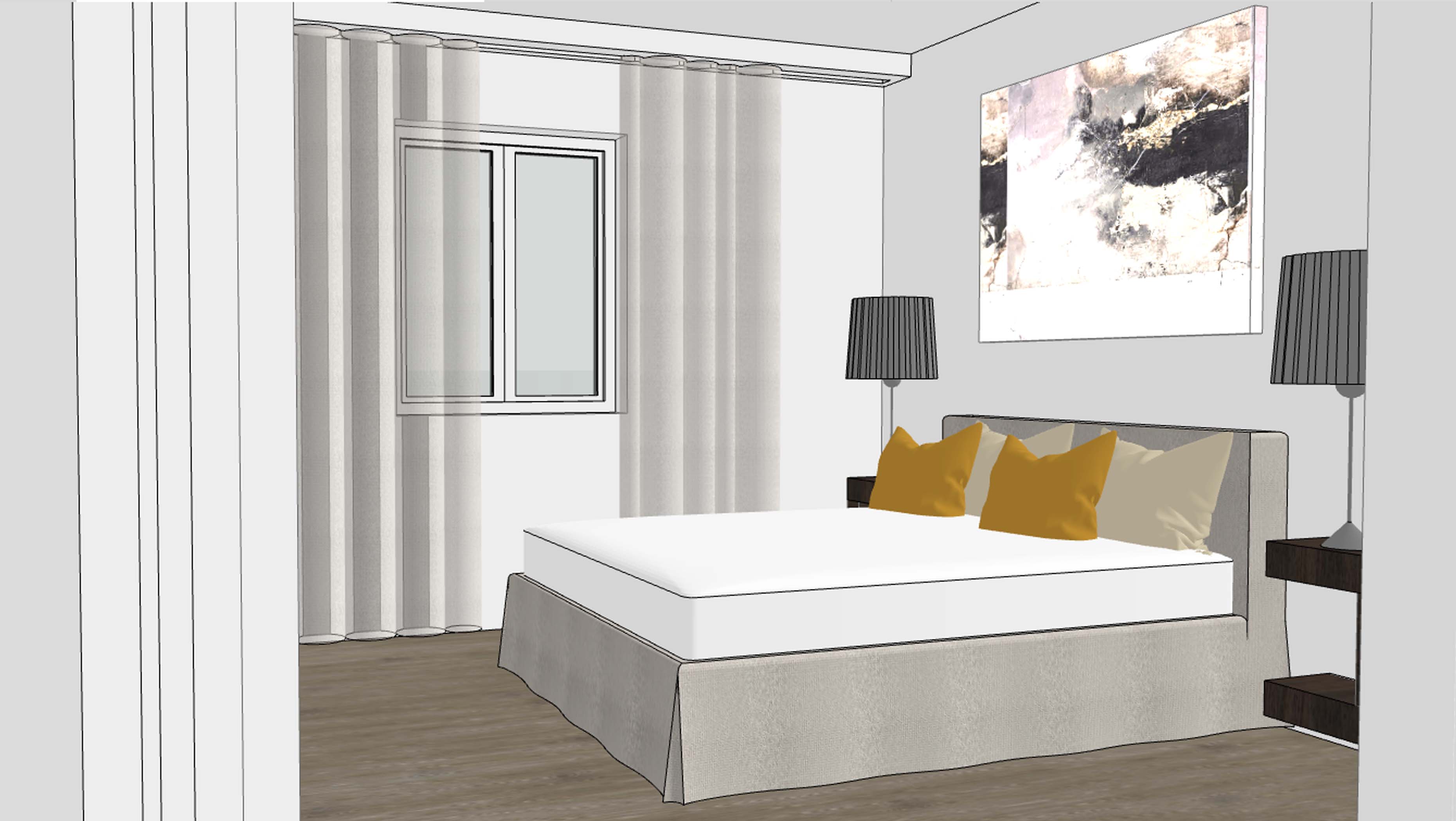 a modern bedroom with beige painted walls a ledlight streaming from the curtainlist up against the ceiling the bed has a large dove and pillows with nice modern patterns over the bed its a chandalier made from seashell for a maritim design on the wall behind the bed it s a big painting of a coast lantern the lamps on the bedshelfs is of light stone material the lampshade is beige textil