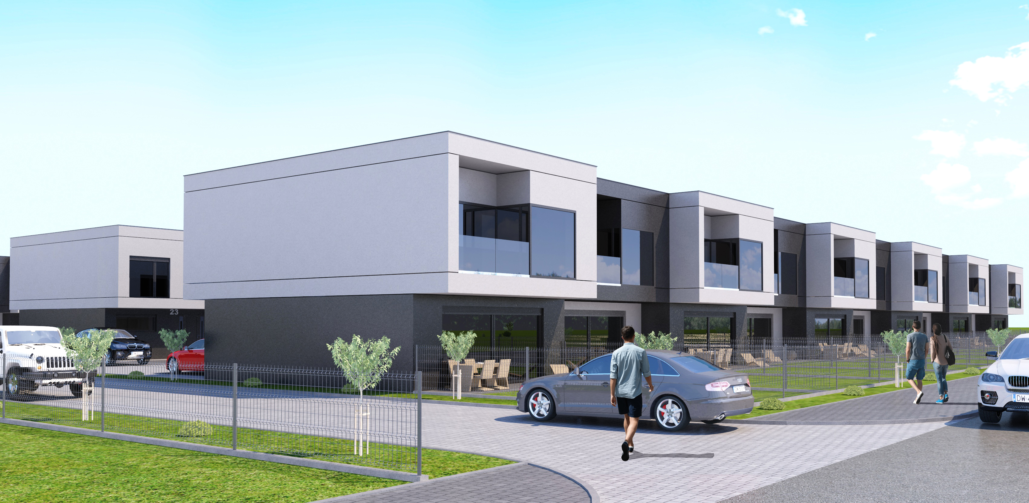 create a photorealistic view do not change the shape of the buildings do not add any inscriptions do not change the inscriptions of numbers and registration plates summer sunset