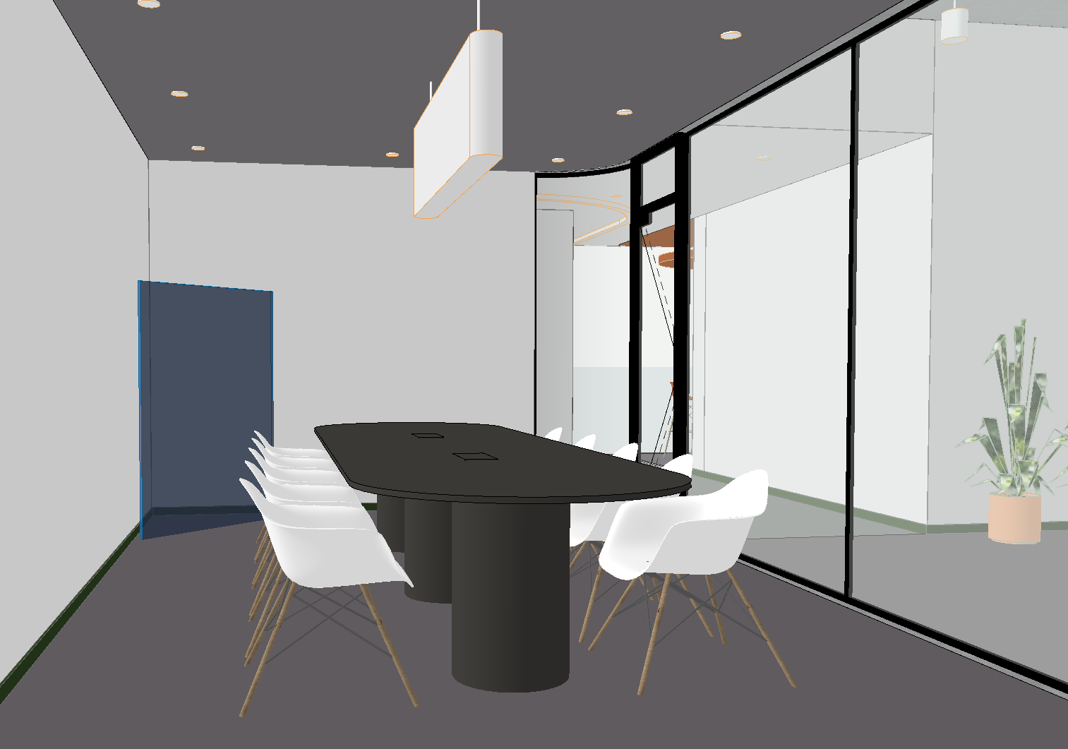 make pfotorealistic image of this meeting room tv on the wall pendant light terracotta pet felt fabric chairs red add tulle curtain for the glass walls