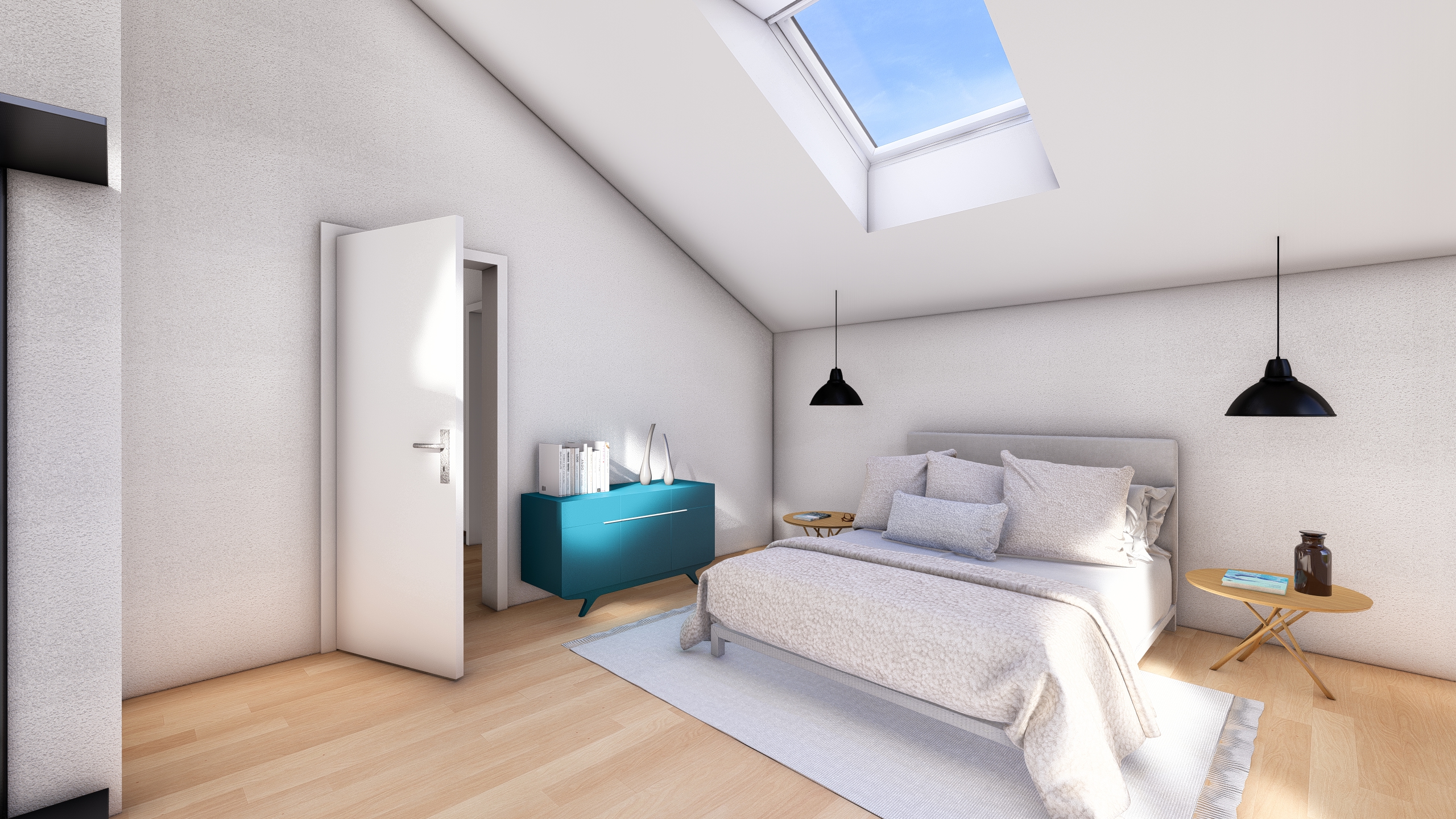 a modern and luxury sleepingrrom room with bright daylight the walls and the ceiling are white