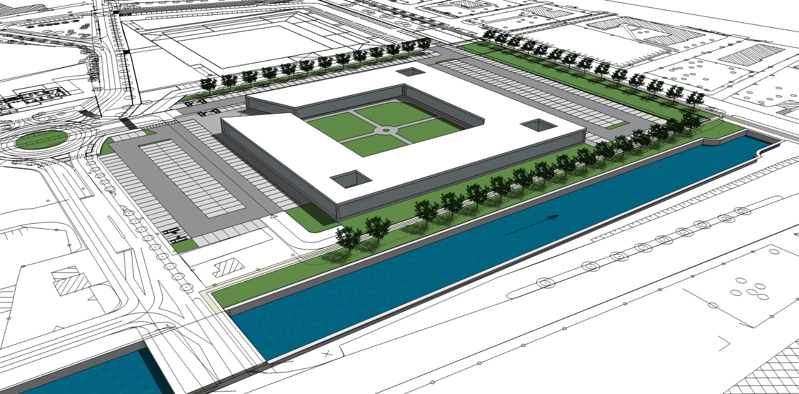 create a stunning architectural illustration of a large modern building complex set in an urban landscape the building is a sleek rectangular design with a central courtyard filled with lush green grass surround the courtyard with structured walkways use light gray for the building exteriors and dark gray for the parking areas add evenly spaced trees in a rich deep green along the pathways and lining the canal the canal water should be a vibrant azure blue reflecting a clear sky include detailed roads and traffic roundabouts in soft grays set the atmosphere to be bright and cheerful capturing the essence of a bustling vibrant community in harmony with nature