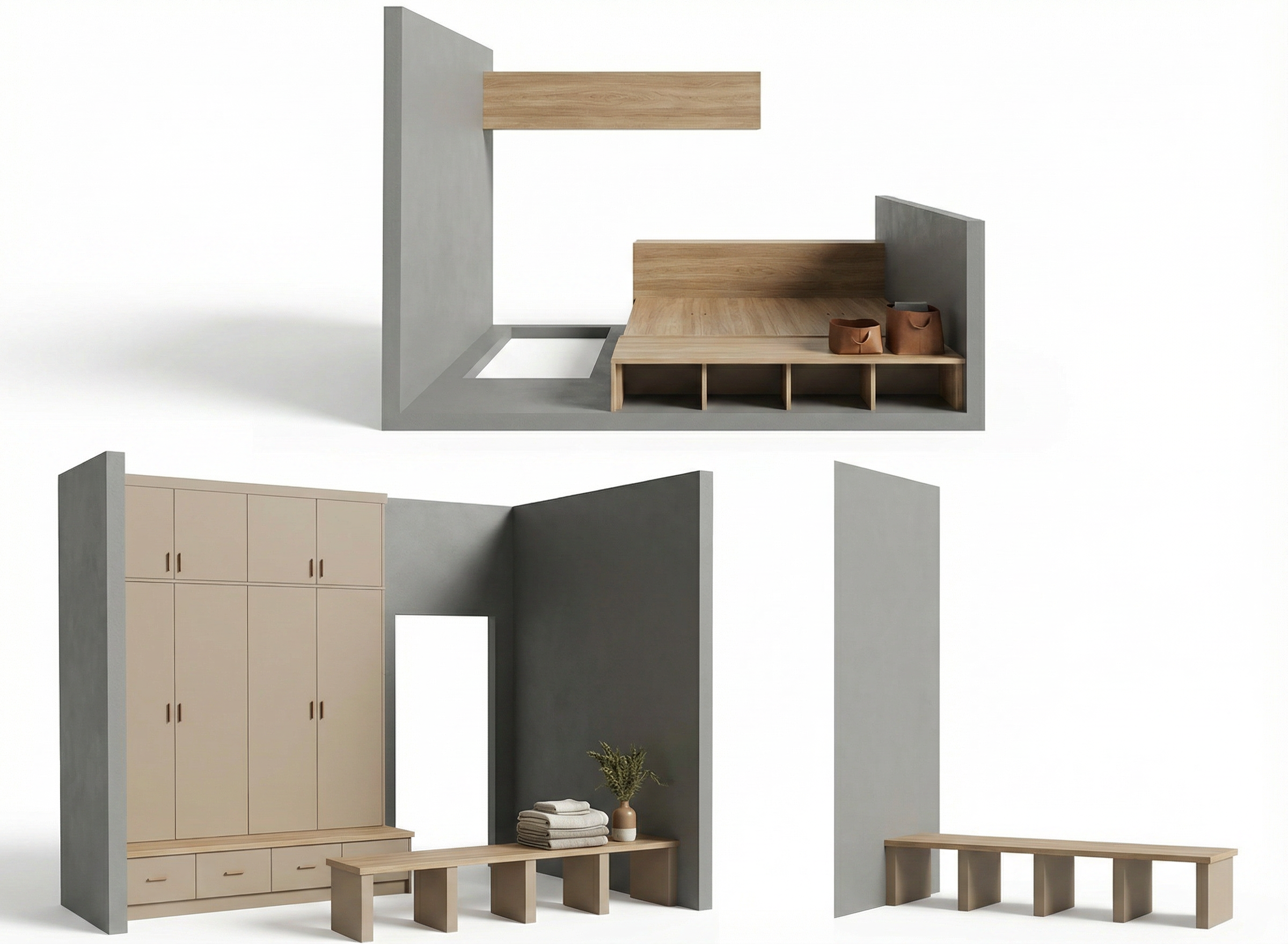 create rendered aerial view of floor plan in warm neutral palette and cottage style include white king bed white sofa and club chair and table with upholstered chairs kitchen with white marble countertops warm medium tone wood floors at bedroom living room and kitchen and green turf in golf simulator rectangle