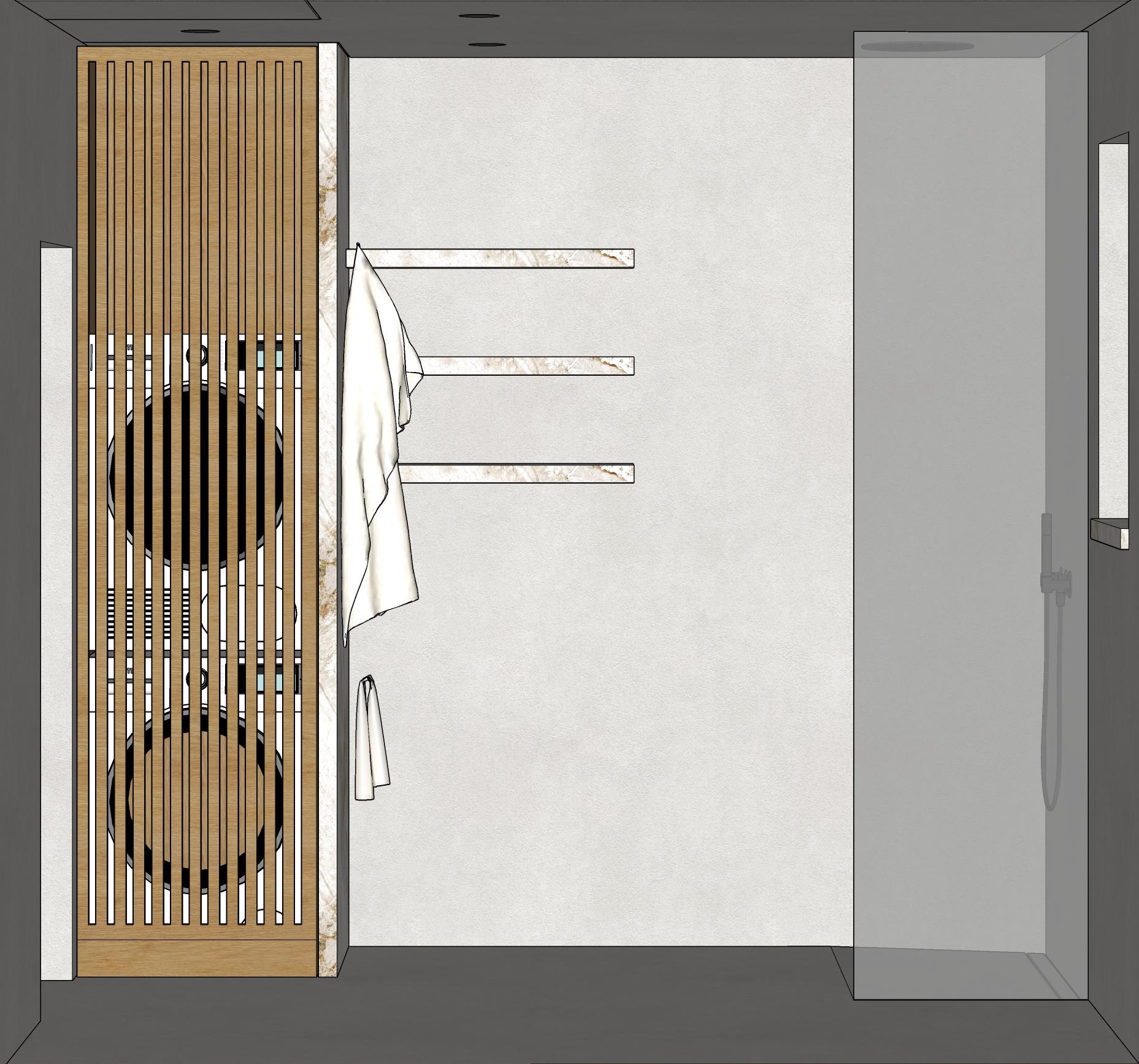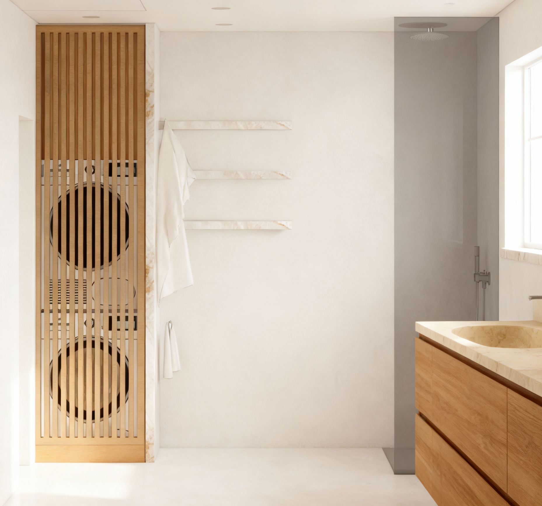 photorealistic image minimalistic scandinavian style bathroom walls and floor from bright beige microcement cabinet from natural bright oak veneer light coming from window on the right