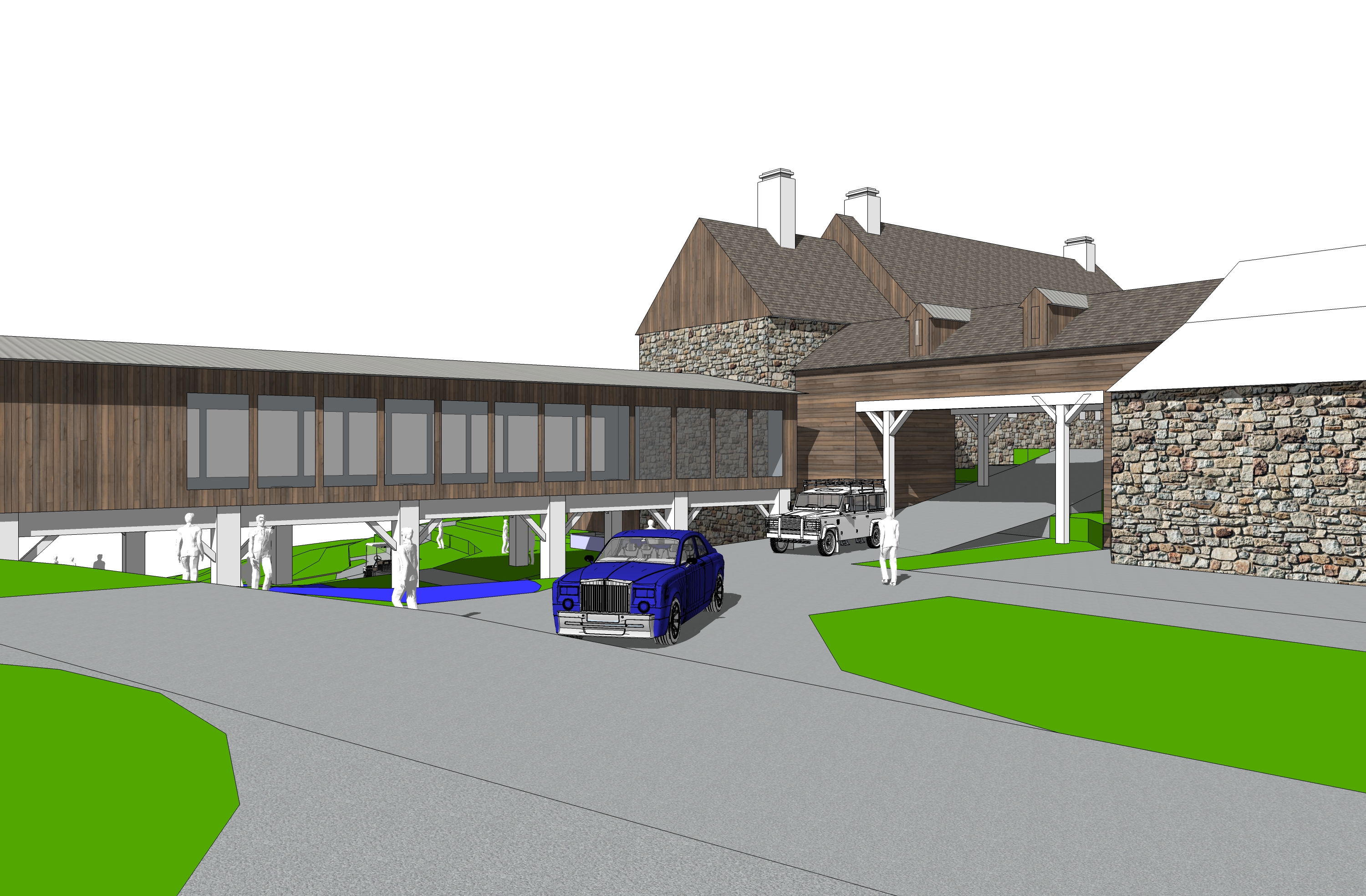 old stone farmhouse covered porte cochrere with vertical shiplap carriage house with dormers tall grass with driveway fog trees in background windows throughout