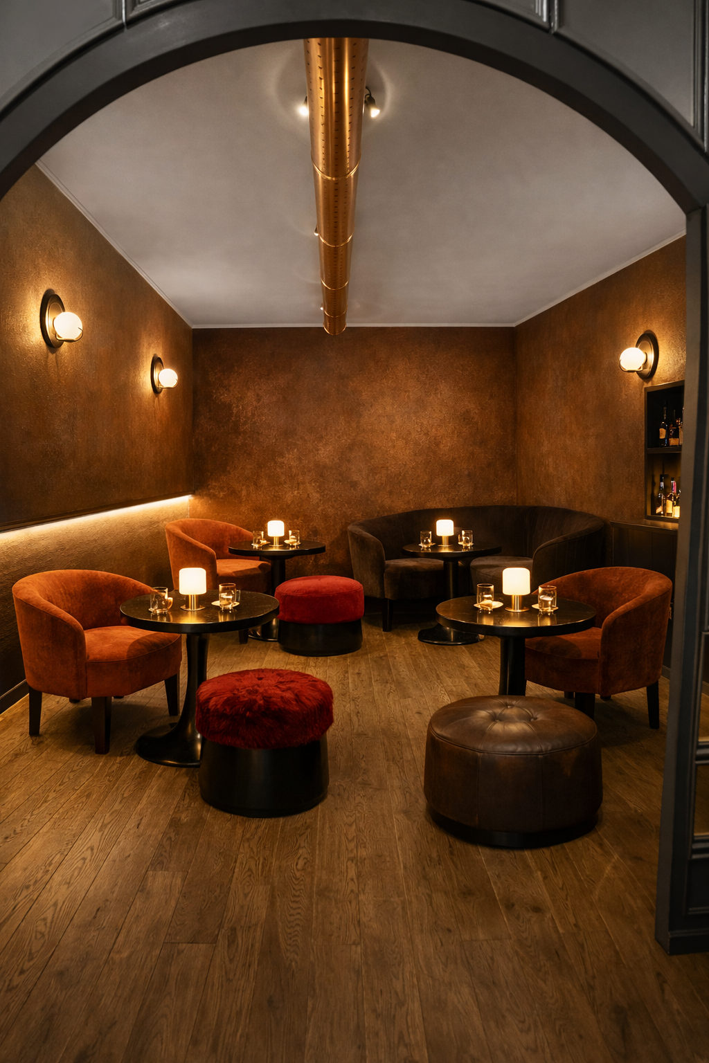 increase the overall ambient brightness slightly keeping a warm intimate lounge atmosphere enhance soft light bounce on walls floor and ceiling without introducing new light sources avoid harsh highlights or cold tones the space should feel more luminous but still cozy and nocturnal