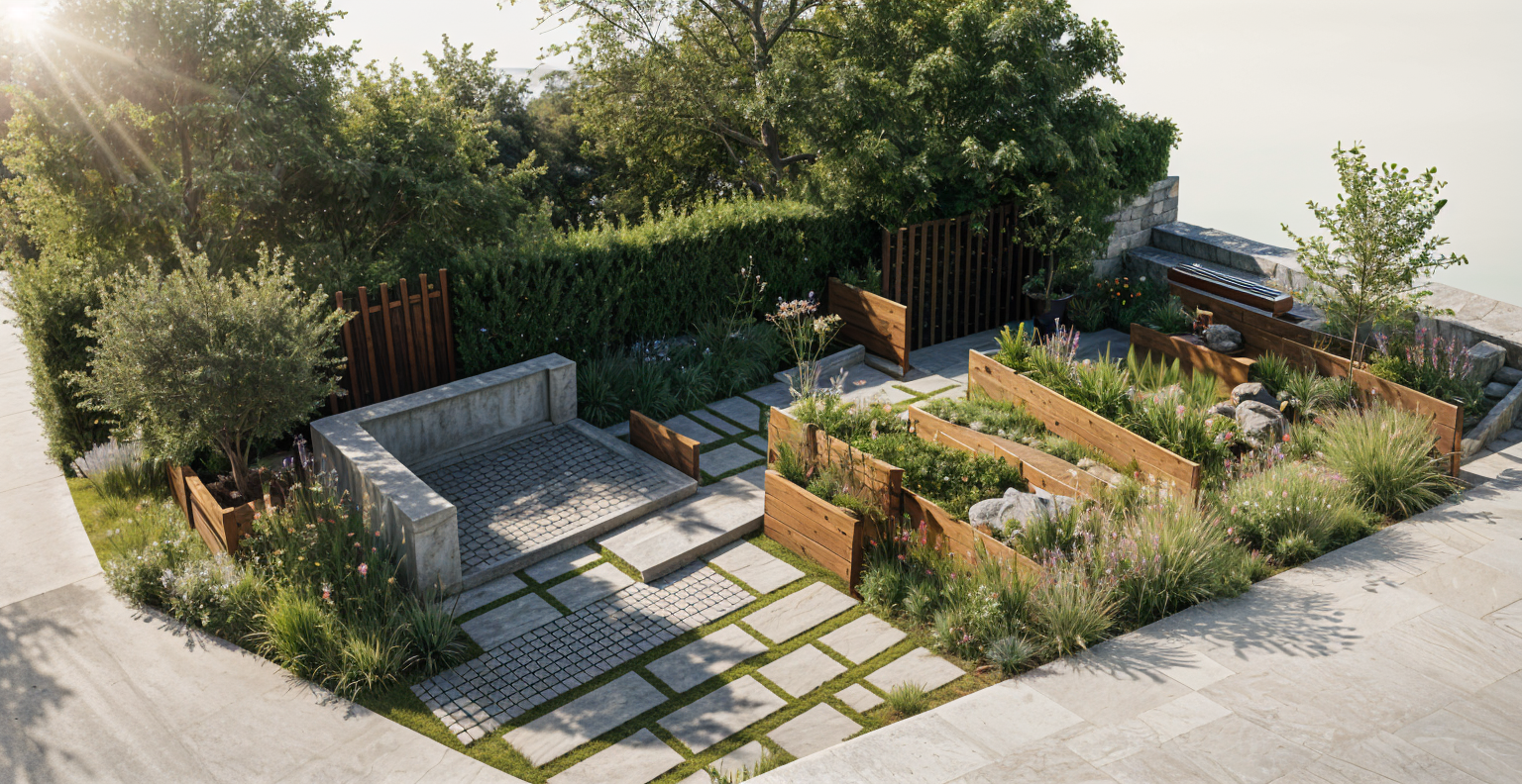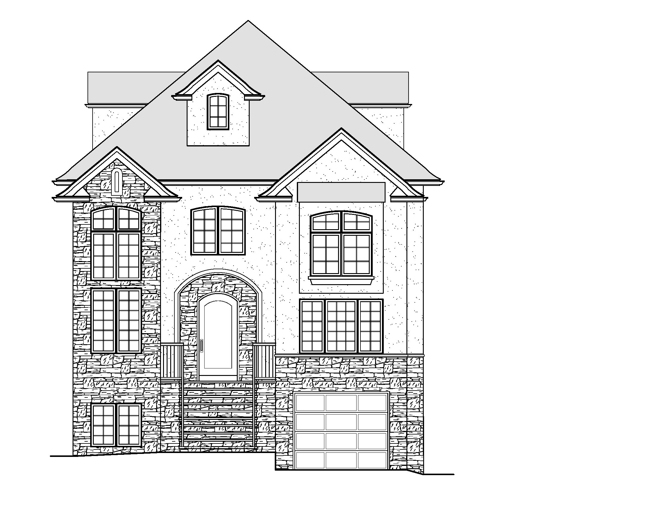render realistic using white stucco with mixed brown color stone and black windows black accents black doors and black roofs set this is a residential neighborhood with large mature trees and very upscale landscaping provide shrubs and landscaping around the base of the house make the surround of the front door black and make the time of day dusk with lights add outdoor lighting next to front door and can lighting in the soffits
